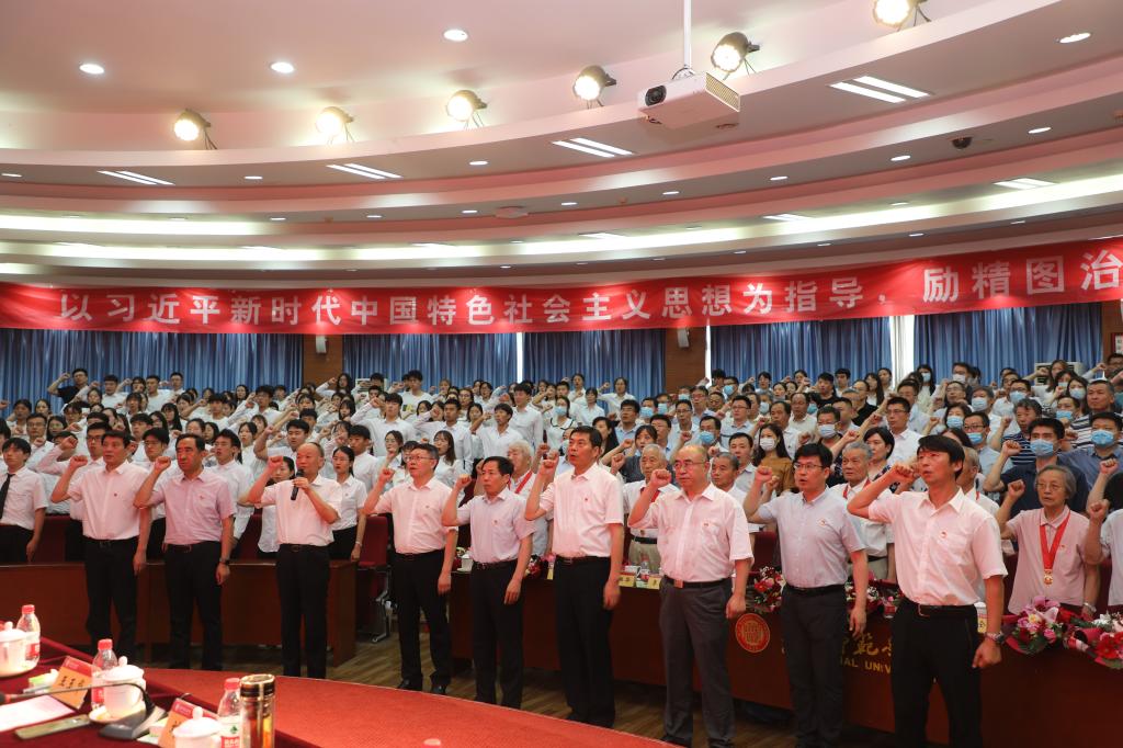 接着,现场举行了新党员代表宣誓和老党员重温入党誓词仪式。在学校党委书记王玉华带领下,全体党员举起右拳,向党旗庄严宣誓。宣誓全过程庄严肃穆,铿锵誓言在学术报告厅久久回荡。
