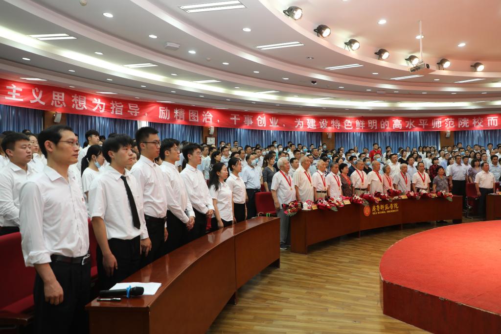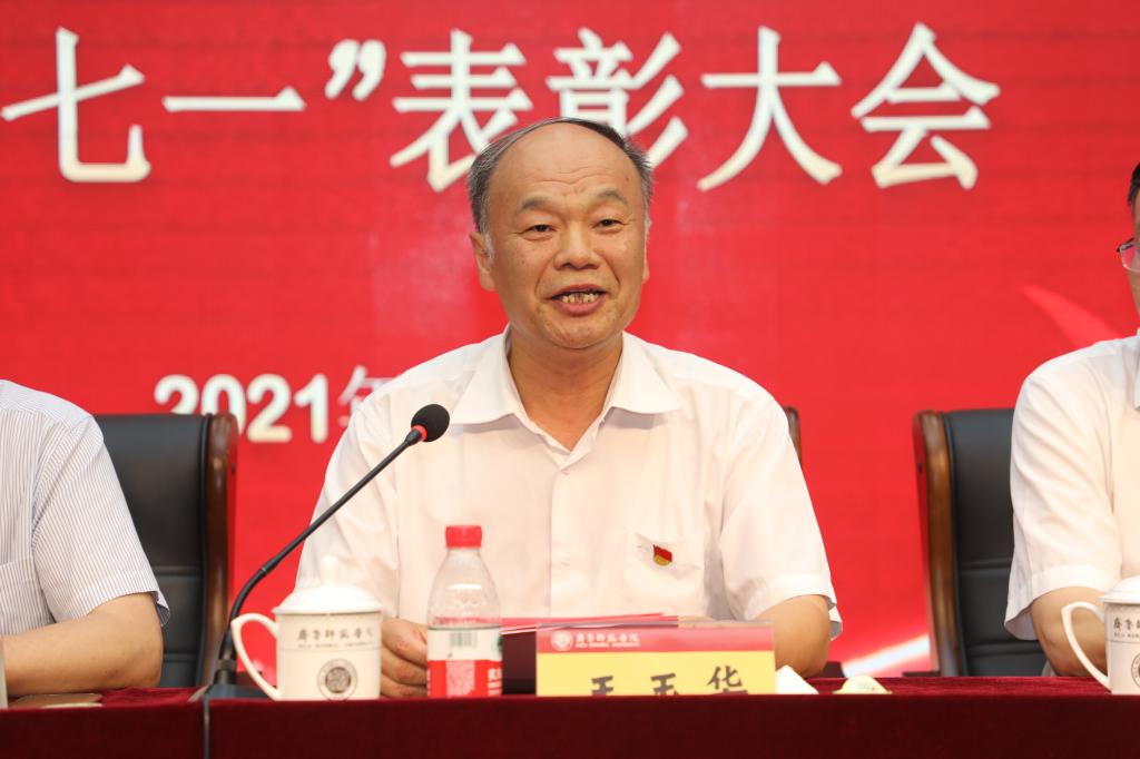 最后,王玉华发表讲话。他首先代表党委向老党员们表示崇高的敬意,向获得表彰的先进党组织和个人以及新发展的党员同志们表示热烈的祝贺,向全校共产党员致以节日的问候。他指出,中国共产党走过100年光辉历程,带领中国人民不畏艰难险阻,不断创造辉煌伟业,实现了国家富强和人民幸福。在党的坚强领导下,一代代师院人大力弘扬奉献精神,围绕不同时期党和国家的中心任务,勇担使命、砥砺前行,谱写了齐鲁师范学院建设发展的壮丽篇章。