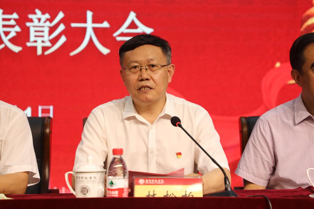 林松柏在主持会议时指出,2021年是中国共产党成立100周年。一百年来,中国共产党以力挽狂澜的担当和气魄团结带领全国各族人民创造了一个又一个的“中国奇迹”。今天,我们庆祝党的生日,重温党的历史,表彰先进、学习先进,具有特殊重要的意义。全校各级党组织和师生员工,要认真学习王玉华书记讲话精神,坚定理想信念、赓续红色基因,从党史学习教育和党的辉煌历程中汲取智慧和力量;要不忘党的初心、践行立德树人使命,准确把握学校发展的新形势、新任务、新方略,团结带领广大师生全力推动学校转型发展;要拼搏奉献、担当作为,以更加饱满的热情、更加昂扬的状态,更加坚定的信心、更加扎实的奋斗,谱写学校发展的新篇章!