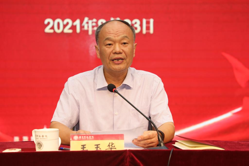 王玉华要求,要紧密结合学校工作实际,全面兴起学习贯彻习近平总书记“七一”重要讲话精神热潮,自觉抢先先学一步、深钻学深一层,在学上做实功、在悟上出真知、在践上见真效。一是要加强组织领导,抓好统筹谋划。要尽快研究制定学习贯彻工作方案,聚焦主题主线、把握工作重点,进一步增强学习的针对性实效性,把抓好学习贯彻习近平总书记重要讲话精神同推进重大任务、重要工作、巡视整改等统筹起来,同抓好党史学习教育结合起来;二是要抓好学习培训,统筹宣传教育。举办专题培训班,组织好宣讲团,举办报告会,利用好学习强国号、校报、校园网等平台,总结推广好典型、好经验,把学习贯彻“七一”重要讲话精神活动不断引向深入;三是要坚持学以致用,做到知行合一。以党史学习教育为载体,把“我为师生办实事”实践活动贯彻全过程,教育引导广大师生进一步弘扬革命精神,发扬红色传统、传承红色基因,赓续共产党人精神血脉。