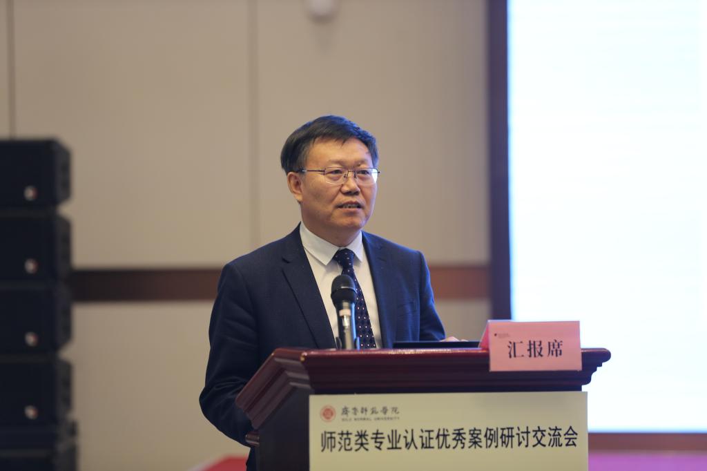 林松柏作了题为《整校推进师范人才培养体系重塑》的专题汇报,他从强化培训、重塑人才培养理念,系统设计、创新整校推进路径,持续改进、重在取得认证实效三个方面,系统介绍了学校以师范类专业认证为契机,持续推进“能力范式”教学改革,实现“学科思维”向“OBE思维”的转变,健全完善基于OBE理念的“三全育人”体系和“三二一”应用型人才培养体系,创新教育教学和人才培养模式,撬动课堂教学发生深层次变革,持续提升办学水平,开创了学校内涵式高质量发展新局面。学校师范类专业认证工作取得显著成效,截至目前,在学校设有的18个师范专业中,已有9个专业通过教育部师范类专业二级认证,3个专业受理认证申请,进入认证轮次的专业占比达到75%。