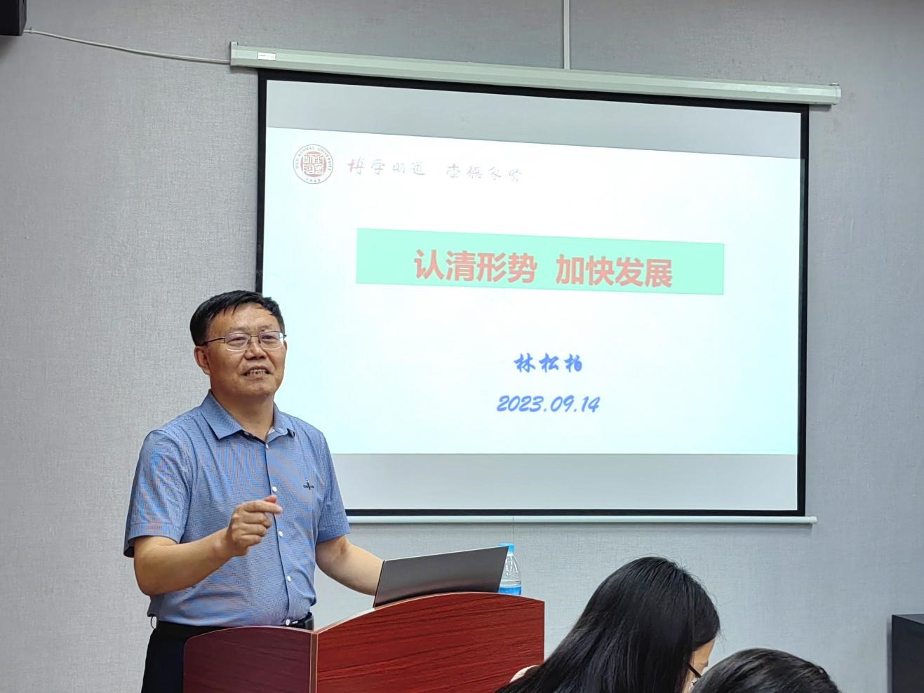 听取汇报之后,林松柏对生命科学学院各项工作给予充分肯定,对老师们的辛苦付出表示衷心感谢。随后,林松柏以《认清形势,加快发展》为题作主题报告。在报告中,林松柏系统分析了学校和生命科学学院的现有基础,面临的国际国内形势,与同类院校和校内其他学院相比存在的优势和短板,明确了学院今后发展的重点任务和具体措施。林松柏要求,生命科学学院要进一步强化党建引领,牢固树立抓好党建是最大政绩的理念,优化理念、转变思维、创新方式方法,加快发展。