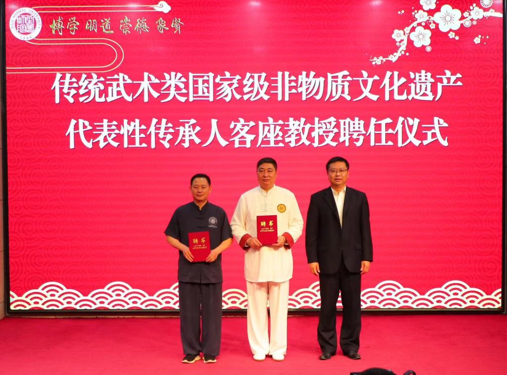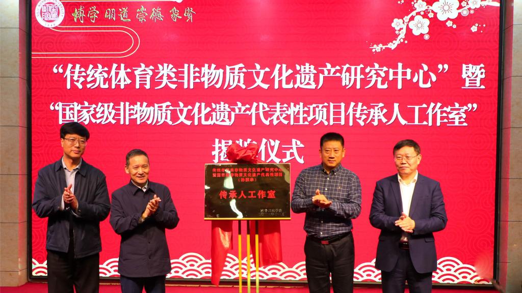 现场举行了“传统体育类非物质文化遗产研究中心”暨“国家级非物质文化遗产代表性项目传承人工作室”揭牌仪式、传统武术类国家级非物质文化遗产代表性传承人客座教授聘任仪式。这是齐鲁师范学院加大非物质文化遗产师资队伍培养力度,支持代表性传承人参与学校授课和教学科研,为早日建成高水平非物质文化遗产传承教育实践基地的又一创举。