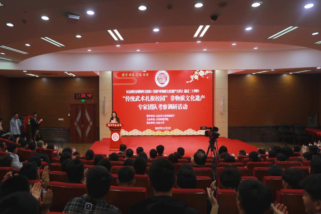 为深入贯彻落实党的二十大精神和习近平总书记对非物质文化遗产保护工作的重要指示精神,纪念联合国教科文组织《保护非物质文化遗产公约》通过二十周年,11月5日,由山东省文化和旅游厅指导,齐鲁师范学院主办,山东大学协办的“传统武术扎根校园”非物质文化遗产专家团队考察调研活动在齐鲁师范学院顺利举行。