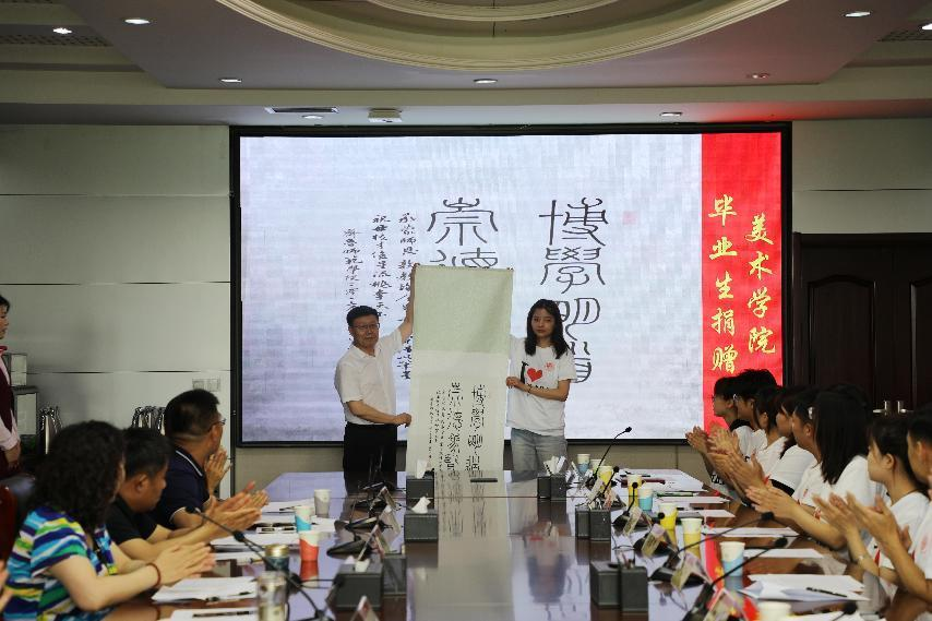 为感谢学校的悉心培育,马克思主义学院毕业生代表向学校捐赠“认一棵大树感恩母校,献一片绿色回报师恩”;美术学院毕业生代表向学校赠送亲手书写的校训“博学明道 崇德象贤”书法作品。林松柏代表学校向毕业生代表赠送《习近平的七年知青岁月》和《基于能力范式的教学改革理论创新和实践》,勉励同学们在矢志奋斗中实现人生价值。