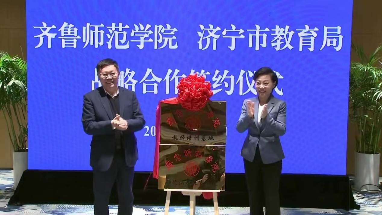林松柏、董冰为“齐鲁师范学院教师培训基地”“齐鲁师范学院师德涵养教育基地”揭牌。