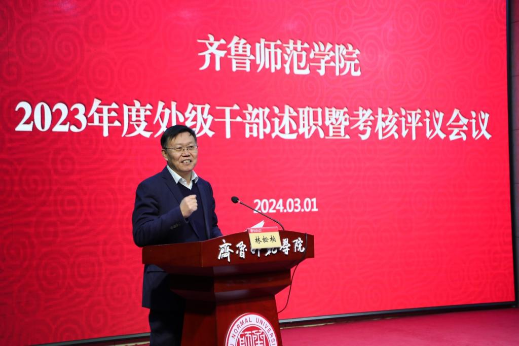 3月1日,齐鲁师范学院在章丘校区第一学术报告厅召开2023年度处级干部述职暨考核评议会议。学校领导出席会议,全体处级干部、省级“两代表一委员”、民主党派校级主委以上人员以及正高级职称教师代表参加会议。会议由党委书记林松柏主持。