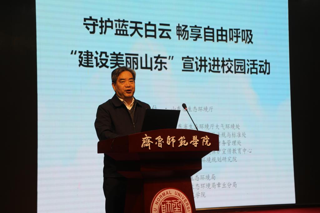 为贯彻落实习近平生态文明思想,进一步加强生态文明宣传教育,增强广大青少年环境保护意识,3月26日上午,由山东省生态环境厅主办的“守护蓝天白云·畅享自由呼吸——‘建设美丽山东’宣讲进校园”活动在齐鲁师范学院章丘校区举行。山东省生态环境厅二级巡视员张金智,学校副校长张兆明党委委员、党委组织部部长杨磊出席活动并致辞,省、市、区生态环境部门有关人员和学校师生代表约200余人参加活动。