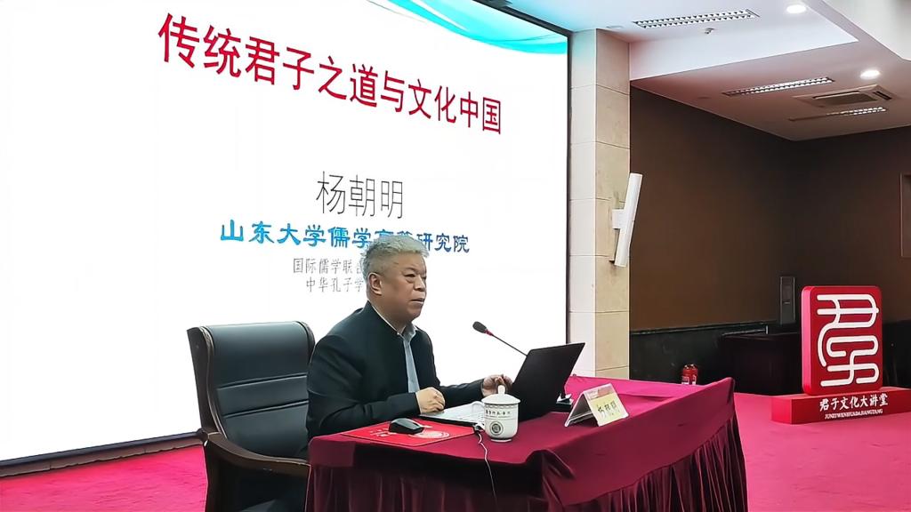 报告会上,杨朝明以《传统君子之道与文化中国》为题,围绕“中国人的家国情怀”“《论语》是君子之学”“致力成就君子人格”三方面展开,强调家国情怀一直是中华传统文化所倡导的价值理念,儒家文化作为中华文化的主干,承载着的齐家、修身、正心、诚意、致知、格物的思想,对新时代涵养深沉的家国情怀具有重要指导意义。他系统阐述孔子的“君子之道”,指出新时代君子应具备“高远笃定的人生追求”“大人君子的使命担当”“坦荡仁和的博大胸襟”,并通过“大道之行,天下为公”阐明我们走中国特色社会主义道路,具有无比广阔的时代舞台,具有无比深厚的历史底蕴,具有无比强大的前进定力。
