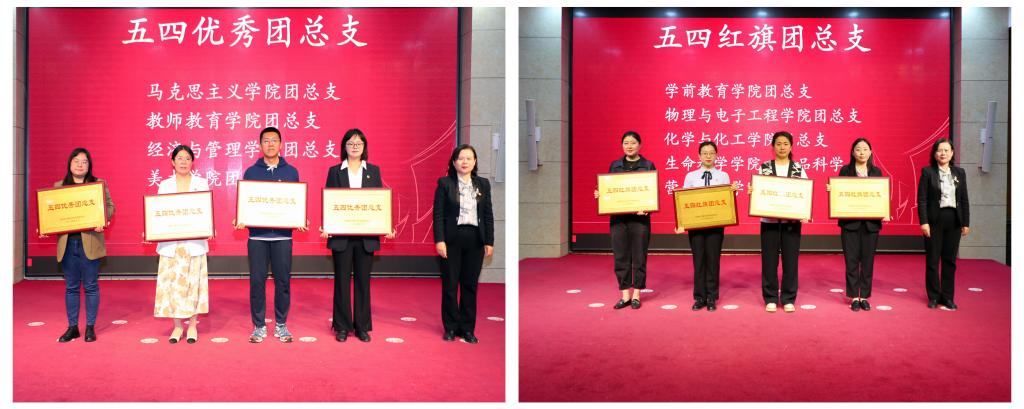 大会宣读了《关于表彰2023年度五四红旗团总支、五四优秀团总支、五四红旗团支部、优秀共青团员、优秀共青团干部的决定》。其中,学前教育学院、物理与电子工程学院、化学与化工学院、生命科学学院被授予“五四红旗团总支”称号;马克思主义学院、教师教育学院、经济与管理学院、美术学院被授予“五四优秀团总支”称号。现场为荣获2023年度青年志愿者优秀个人、第十四届“挑战杯”大学生创业计划竞赛校赛金银铜奖、“主题团日”活动十佳优秀案例、“我为同学做实事”实践活动十佳优秀案例等项目的集体和个人颁发荣誉证书。