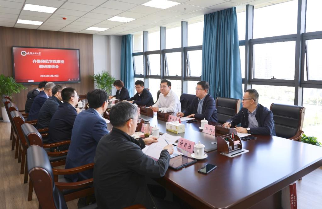 24日上午,两校在安徽师范大学召开交流座谈会,安徽师范大学党委副书记、常务副校长熊宇杰出席。郑秀文代表学校对安徽师范大学给予学校的支持和帮助表示衷心感谢,并从学科建设、教育教学、科学研究等方面介绍了学校的基本情况及发展思路。他表示,齐鲁师范学院与安徽师范大学有着深厚的历史渊源,多年来始终保持着密切联系,今后要进一步推进两校在学科建设、人才培养、高层次科研成果培育以及研究生联合培养等方面的合作,切实推动两校关系再上新台阶。熊宇杰对郑秀文一行表示热烈欢迎,简要介绍了安徽师范大学办学特色、人才培养等基本情况,表示两校同属师范类院校,有着良好的合作交流基础,希望两校以此为契机,持续深化交流,广泛开展合作,共同发挥师范教育的引领作用,为更好地服务基础教育发展、建设教育强国作出更大贡献。