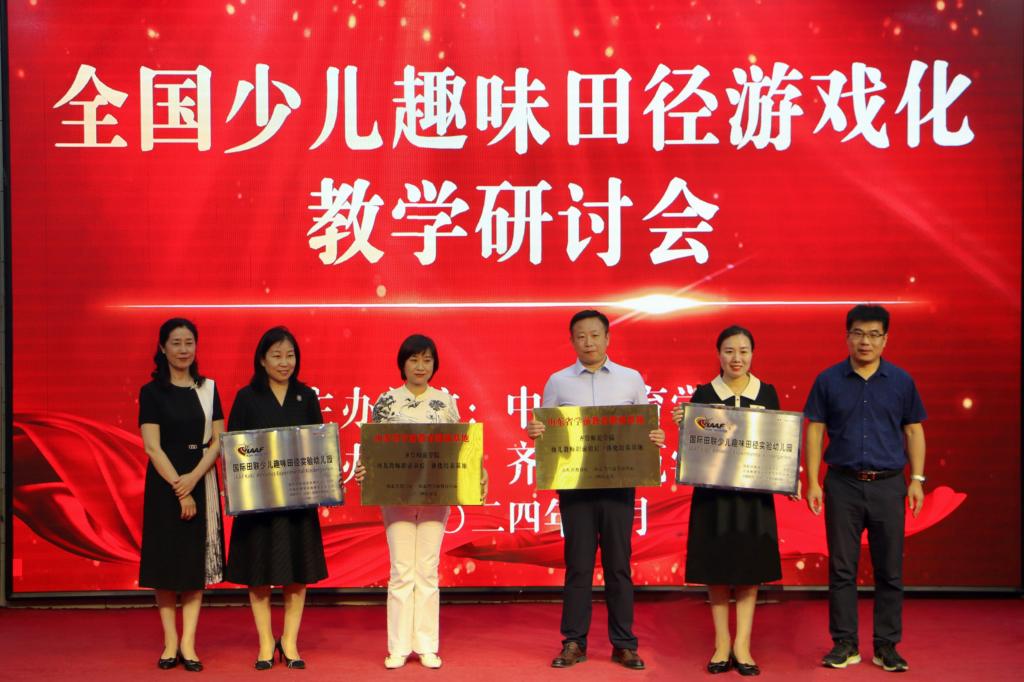 会议还举行了世界田联少儿田径项目推广园校、山东省学前教育教研基地体育游戏试点幼儿园·授牌仪式。齐鲁师范学院教务处处长张克玉为济南市长清区第三实验幼儿园、济南市章丘区泉山实验幼儿园、济宁市兖州区实验小学附属幼儿园授牌。
