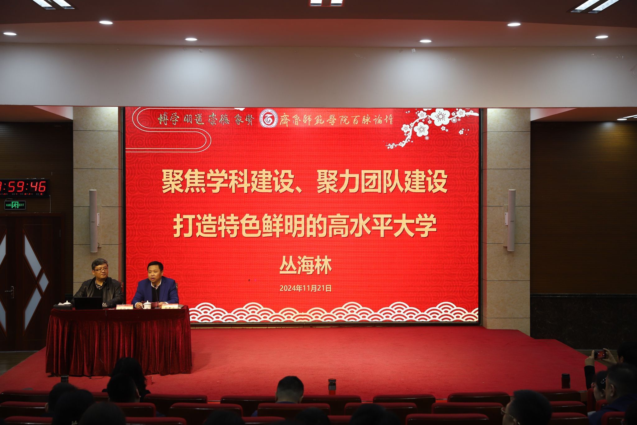 11月21日下午,由科研处主办的2024年第14期“百脉论坛”讲座在章丘校区第一学术报告厅举行。山东理工大学党委常委、副校长丛海林教授受邀作了题为《聚焦学科建设、聚力团队建设,打造特色鲜明的高水平大学》的报告。学校党委副书记、校长郑秀文主持报告会。