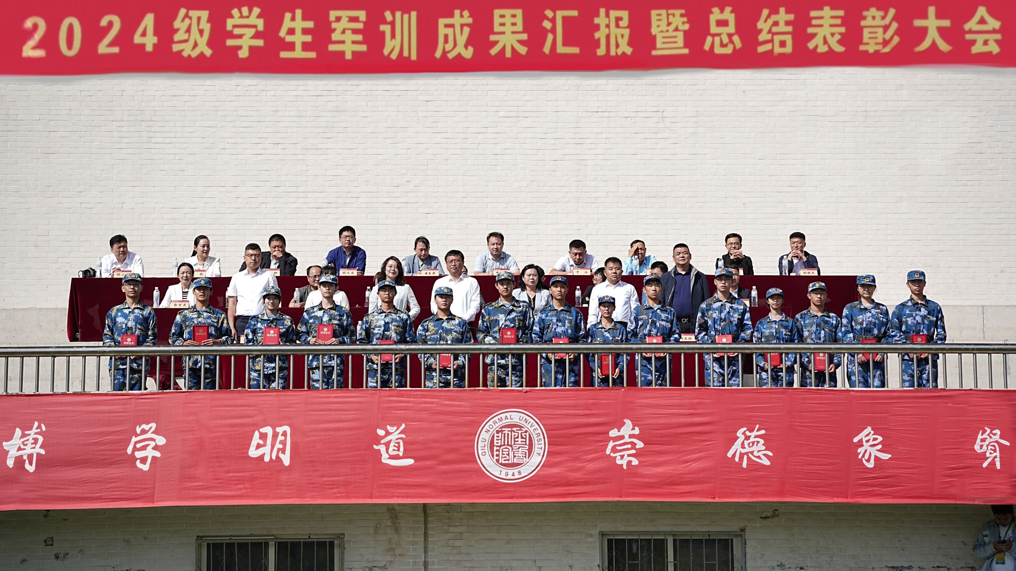 孙磊宣读《齐鲁师范学院2024级新生军训表彰决定》,共有52名优秀教官、28名优秀指导员、102名优秀标兵、102个优秀内务宿舍和15个优秀方队受到表彰。