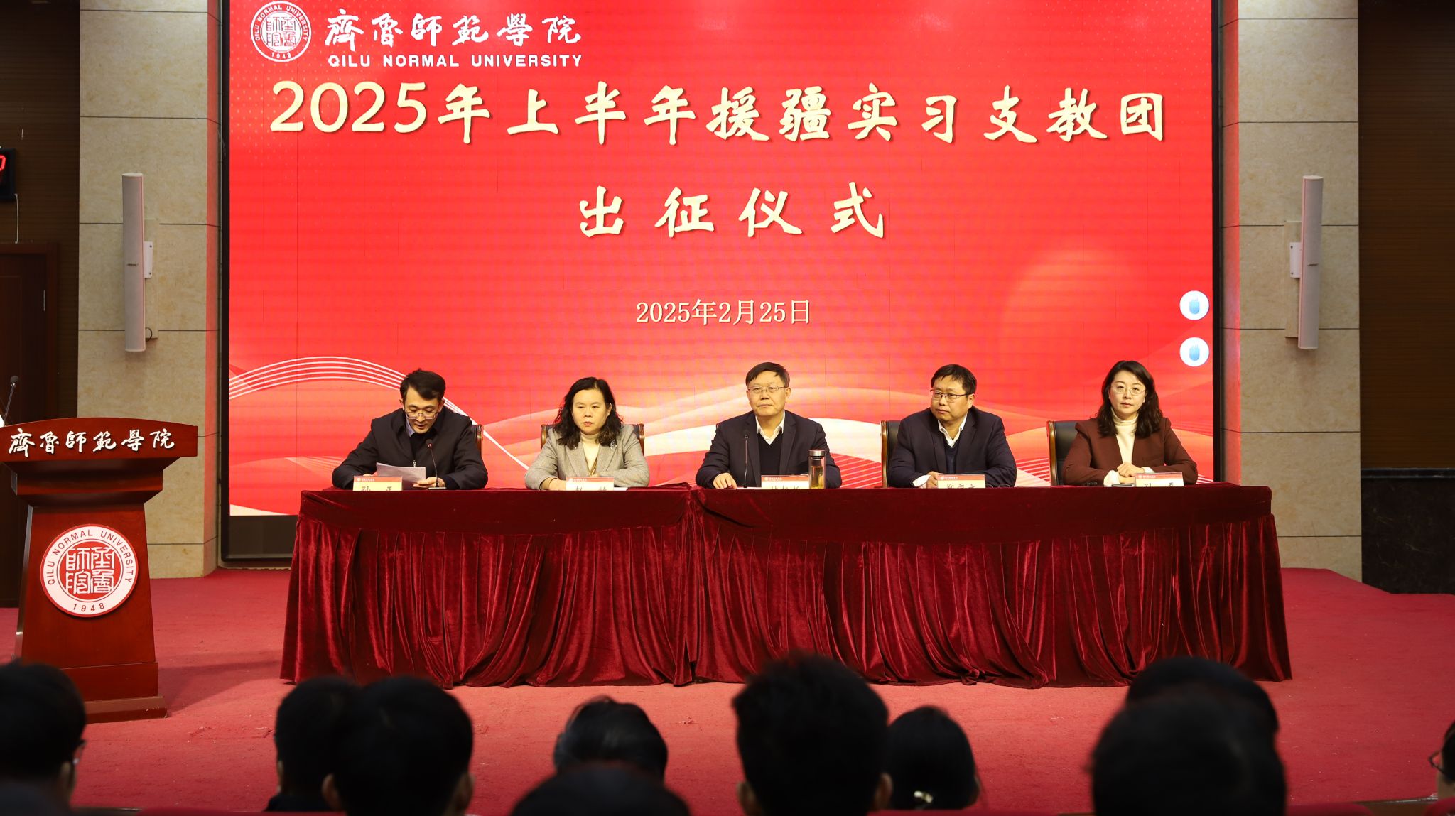 2月25日上午,齐鲁师范学院2025年上半年暨第七批援疆实习支教团出征仪式在章丘校区第一学术报告厅隆重举行。党委书记林松柏,党委副书记、校长郑秀文,党委副书记赵敏,党委委员、副校长孙正,党委委员、宣传部部长孙磊出席仪式。学生工作部、团委、教务处负责人,教师教育学院、文学与历史文化学院、音乐学院、体育学院、美术学院党政负责人,第七批援疆实习支教团全体师生参加。出征仪式由孙正主持。