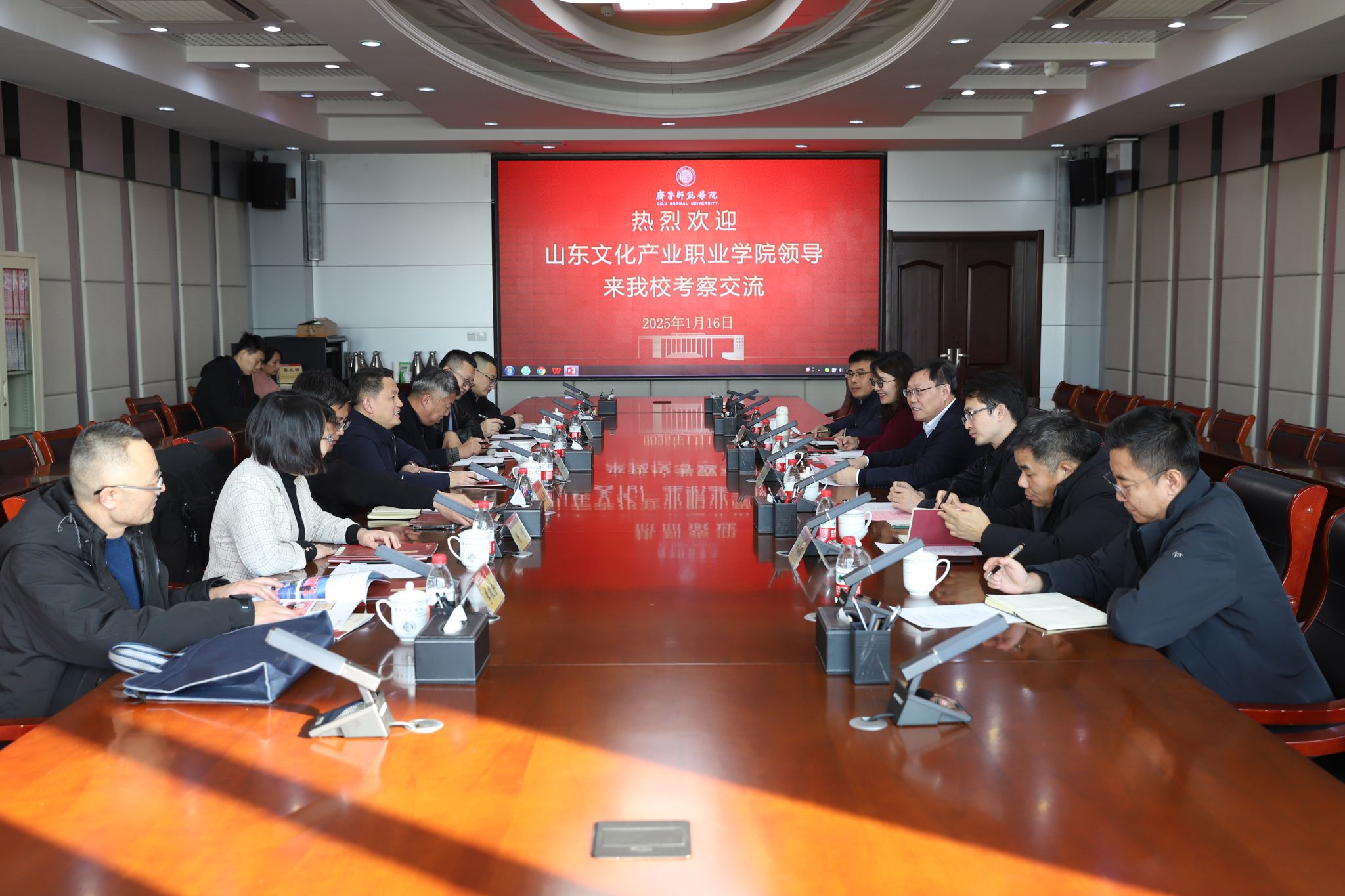 1月16日上午,山东文化产业职业学院董事长李京平一行7人来校考察交流。学校党委书记林松柏,党委委员、副校长孙正,党委委员、宣传部部长孙磊接待来访。双方就深化合作、共谋发展举行座谈。座谈会由孙正主持。
