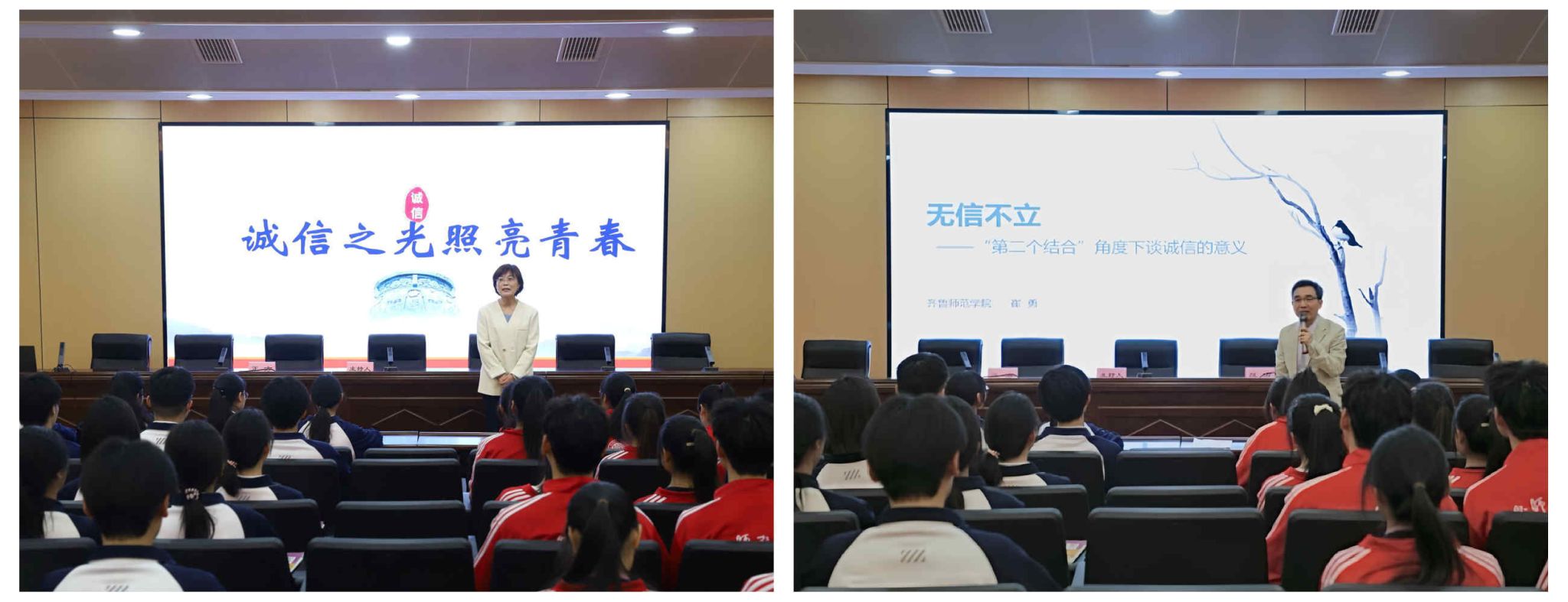 进入课堂内,高中段和大学段的课程接力呈现。临朐实验中学程哲老师以《诚信之光照亮青春》为题,以“诚信吃不吃亏”为辩题,在辩论中师生达成共识,认识到诚信是青春成长的 “必修课”,更是未来踏上社会的 “通行证”。齐鲁师范学院马克思主义学院崔勇副教授则从 “第二个结合” 的角度,以《无信不立》为题,深入阐释诚信作为中华优秀传统文化核心价值理念的现代意义,结合新时代青年的使命担当,呼吁大学生将诚信内化为精神追求、外化为自觉行动,在实践中践行诚信准则。