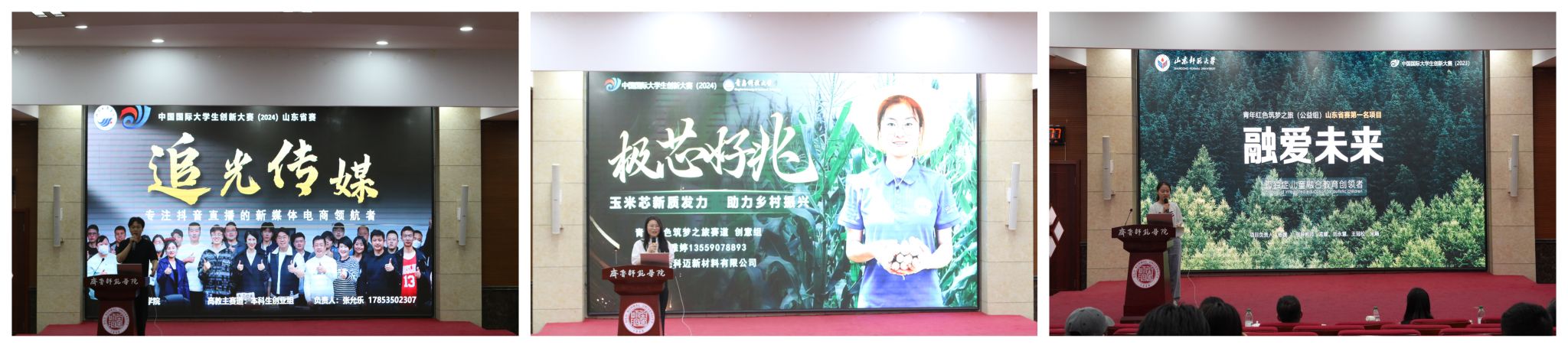 在宣讲环节,来自山东工商学院的“追光传媒”团队、青岛科技大学的“极芯好兆”团队和山东师范大学的“融爱未来”团队的师生代表,深入分享了项目培育路径和参赛经历以及团队成员在参赛过程中的成长和收获感悟,赛事组织部门负责人和项目指导老师分别从不同层面分享了项目遴选、打磨、备赛的经验,宣讲既有理论深度又具实践温度,现场师生反响热烈。