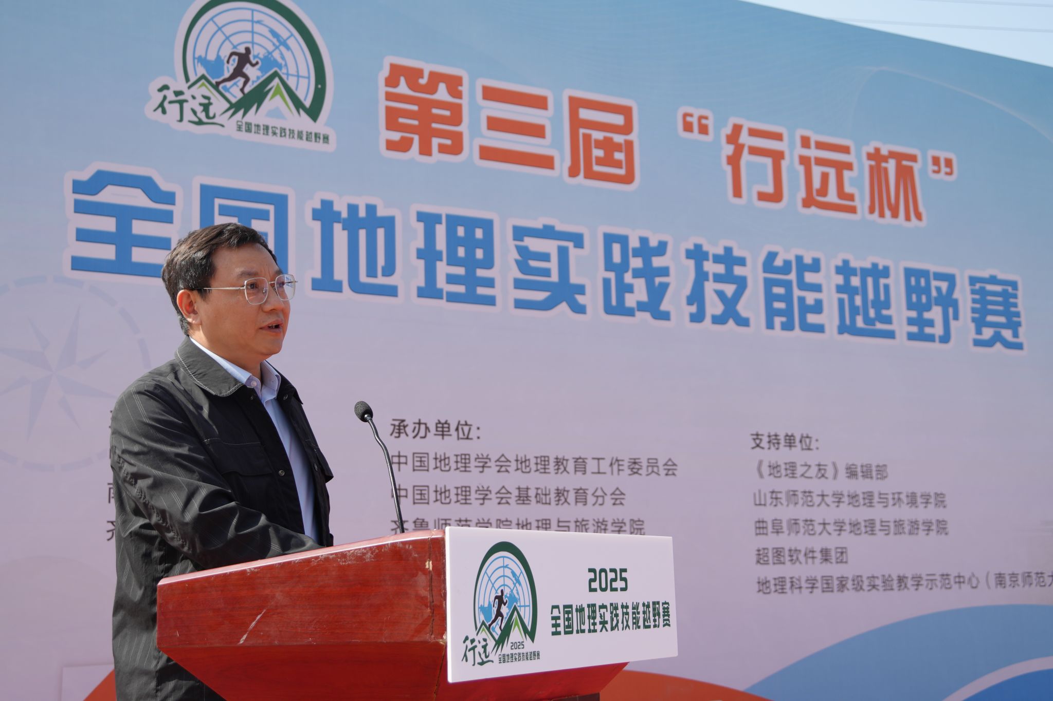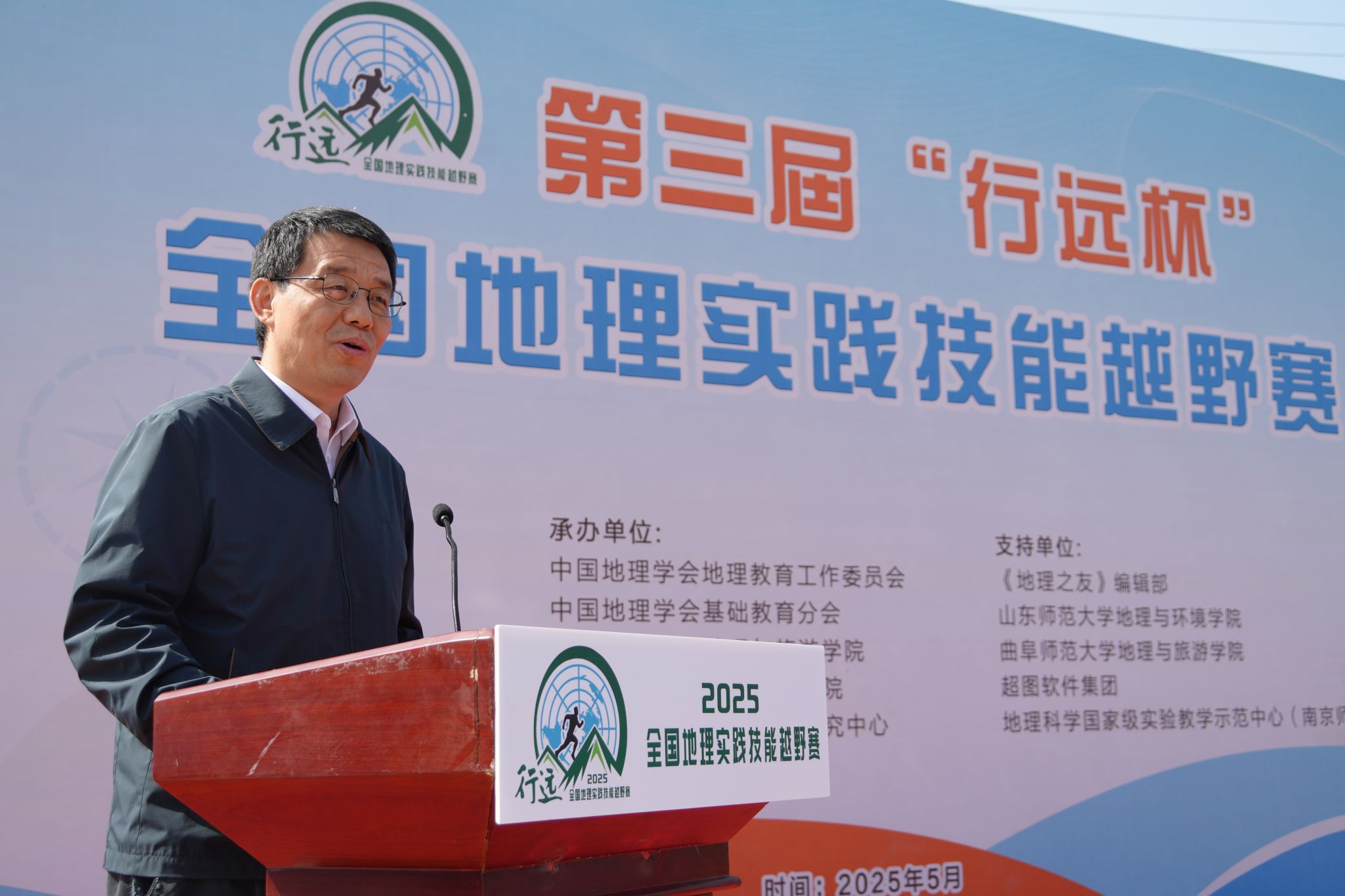 曾宪文代表山东省教育厅祝贺赛事成功举办,指出野外考察实践对人才培养、教育范式转换及服务国家战略的重要意义,强调赛事落户山东的积极作用,并提出保证办赛水准、强化成果运用、深化科教融合的殷切期望。