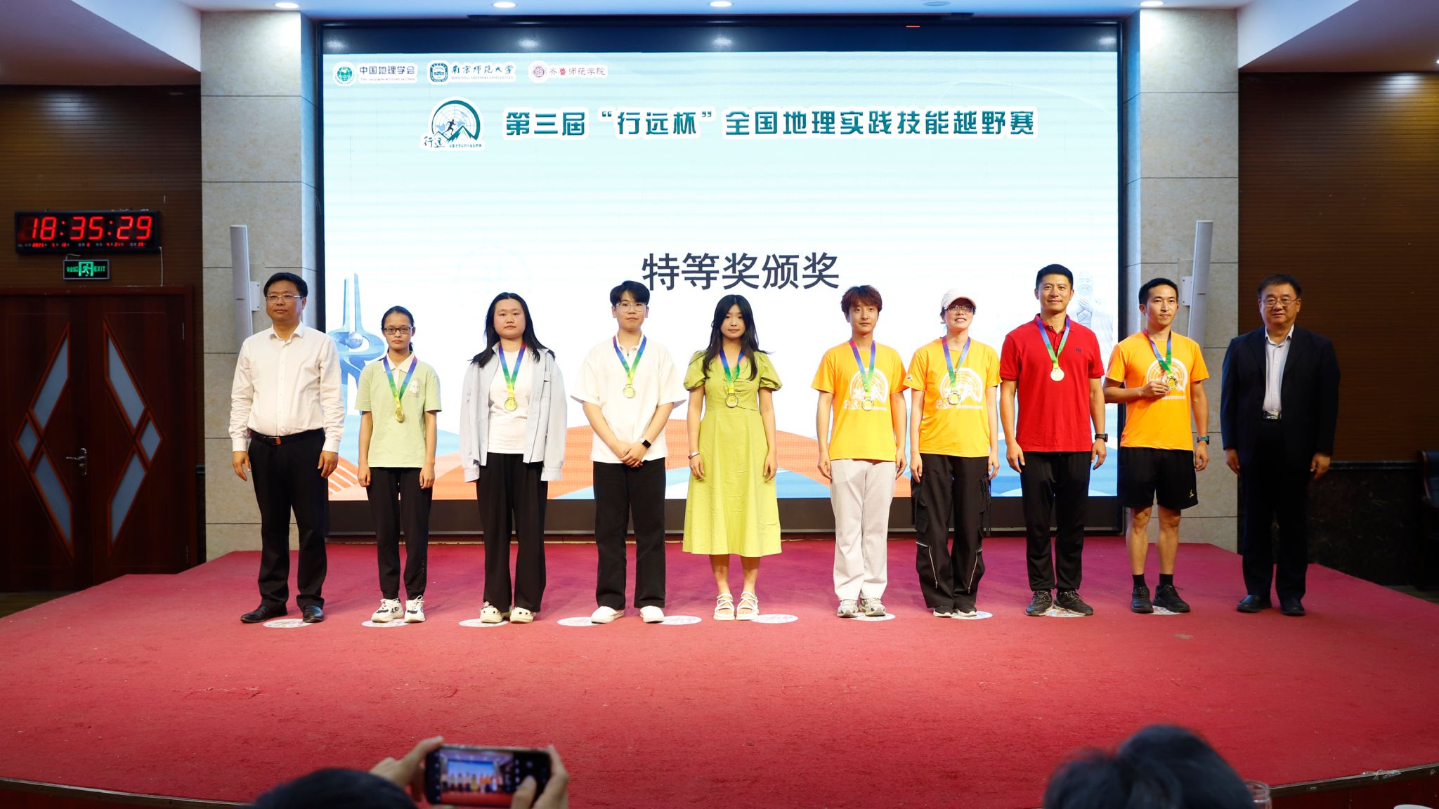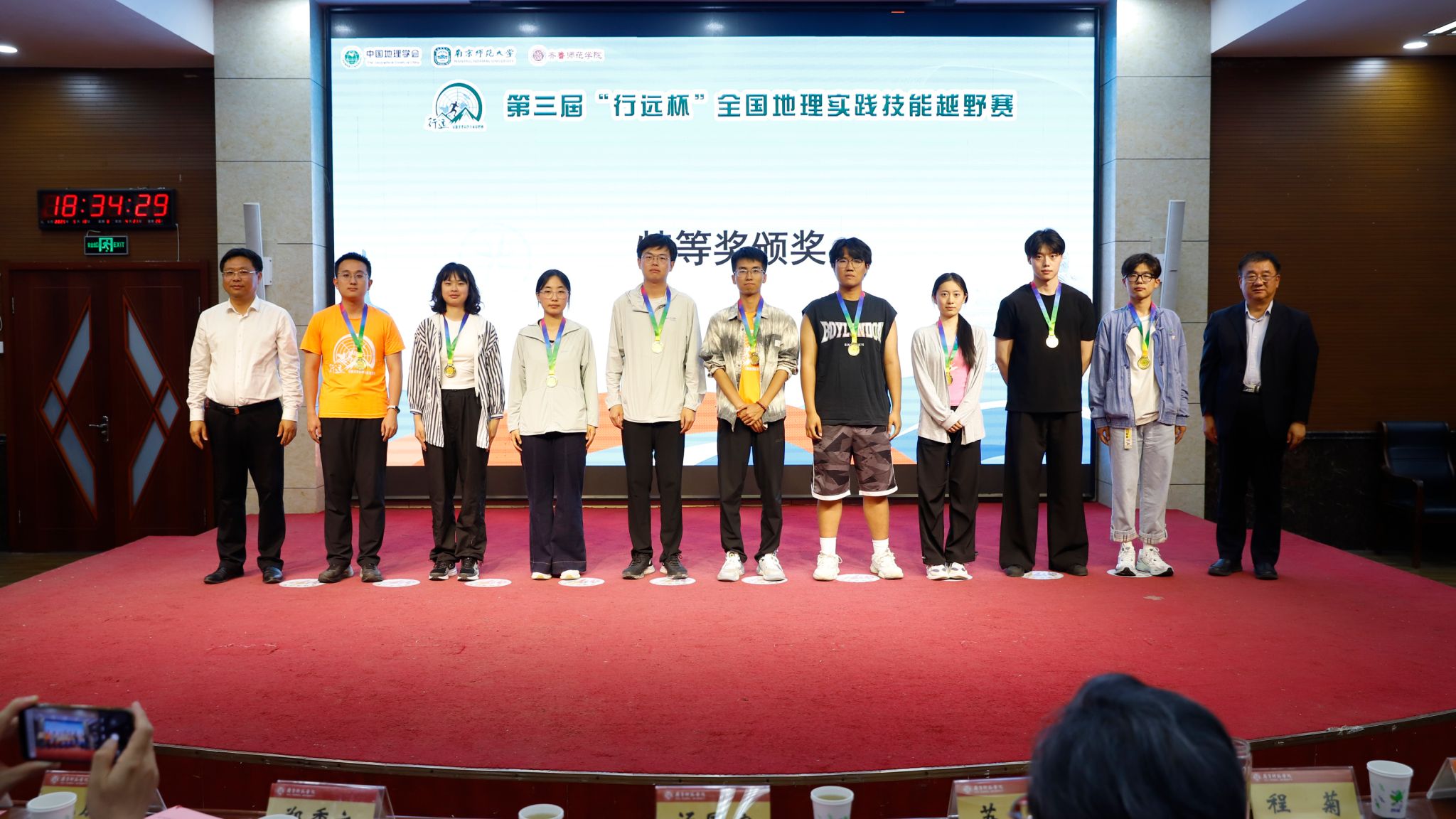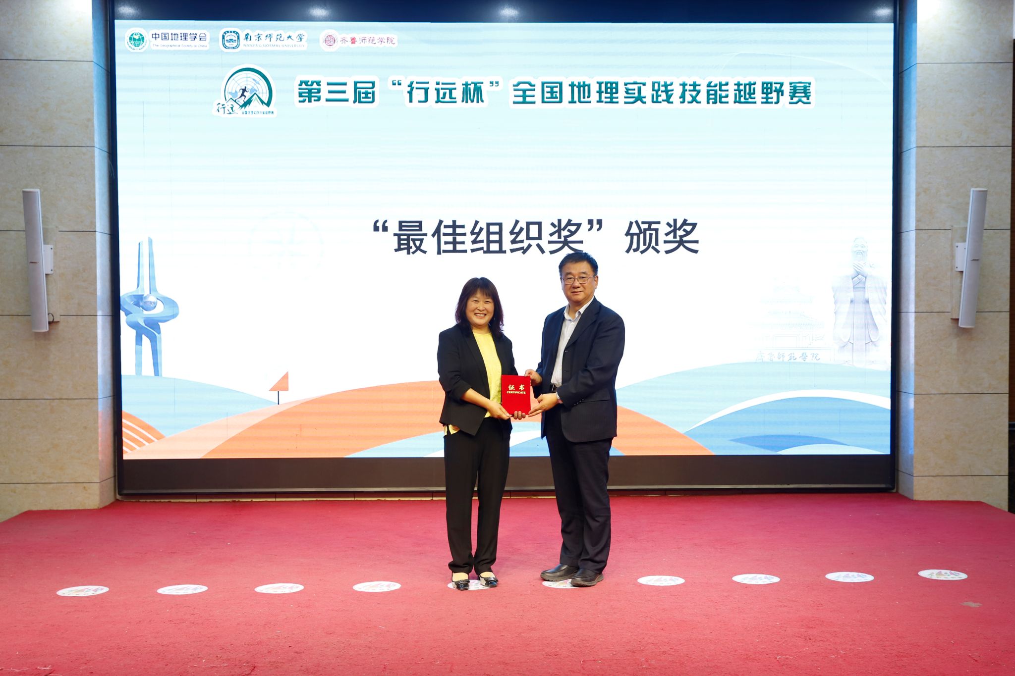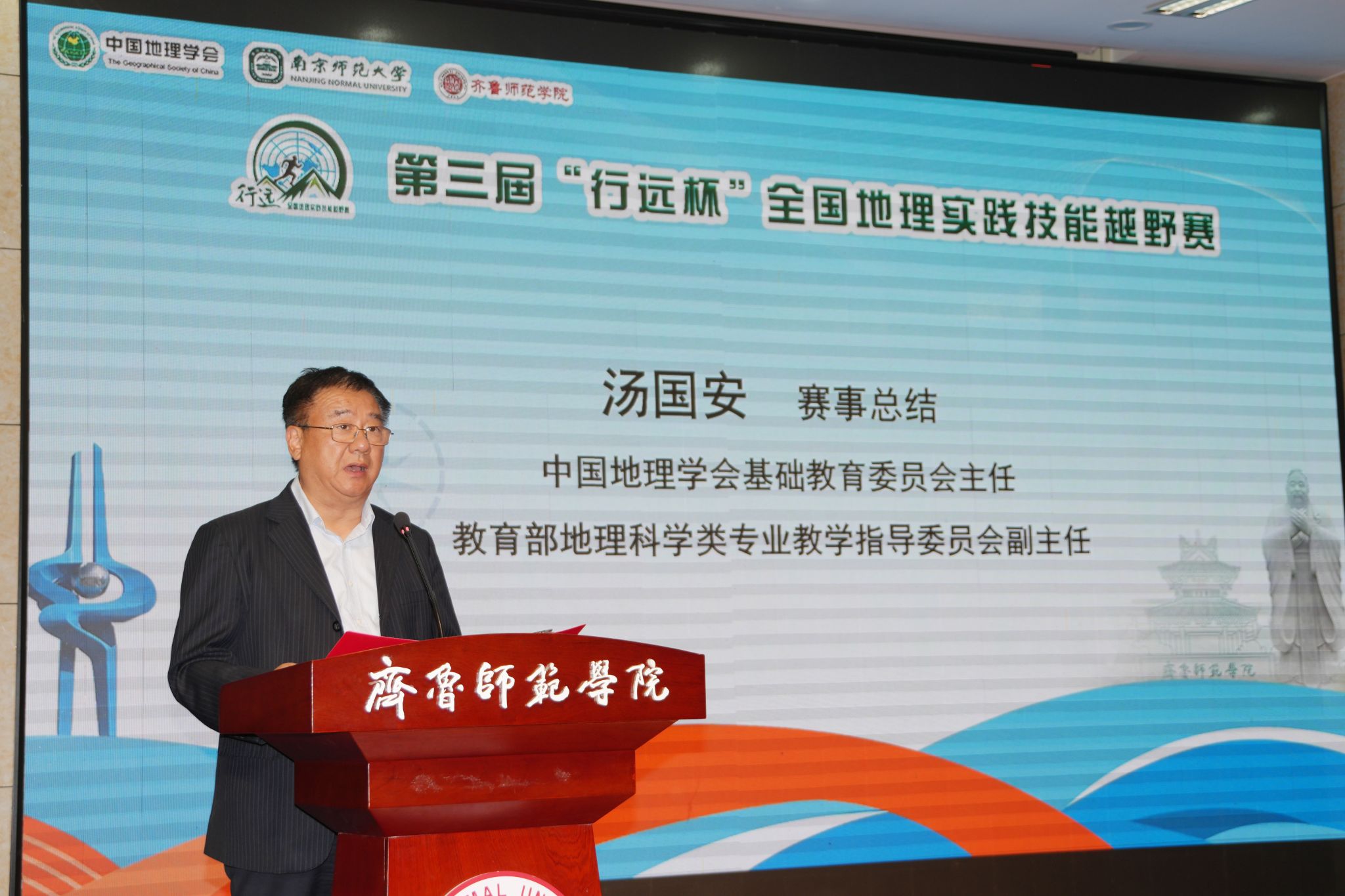 汤国安、郑秀文为获得特等奖的选手颁奖;南京师范大学地理科学学院党委书记苏锦、山东地理学会理事长王成新为获得一等奖的选手颁奖;南京师范大学地理科学学院教授赵媛、济南地理学会理事长程菊为获得二等奖的选手颁奖;南京师范大学地理科学学院副院长汪涛、齐鲁师范学院地理与旅游学院院长王敏为获得三等奖的选手颁奖。最后,组委会向下一届赛事承办单位北京师范大学珠海校区授旗。
