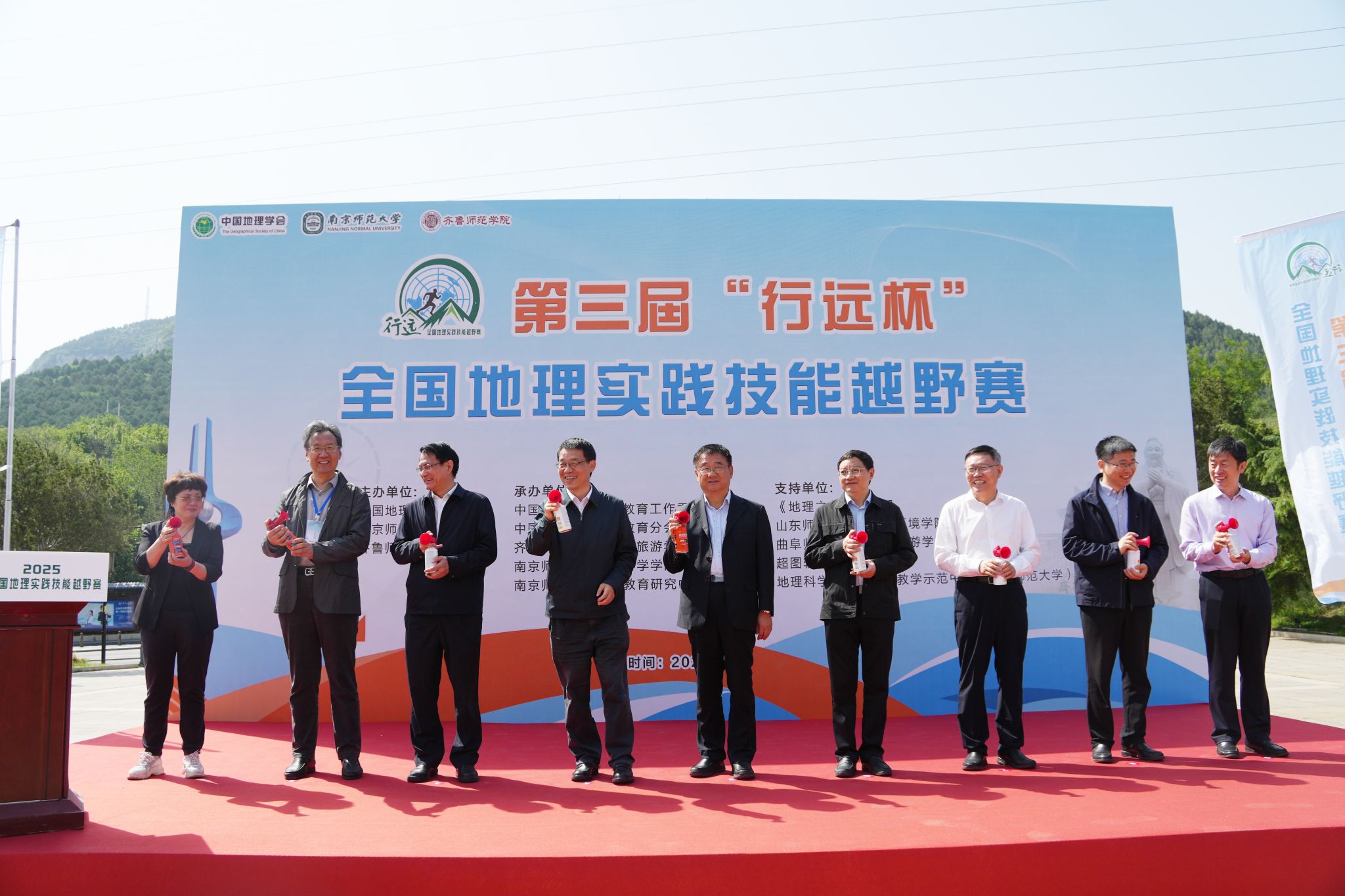 参赛选手代表发言,表达了公平参赛、互学互鉴的竞赛态度。汤国安向齐鲁师范学院地理与旅游学院授旗。与会领导嘉宾共同上台鸣响发令器,第三届“行远杯”全国地理实践技能越野赛正式开幕。