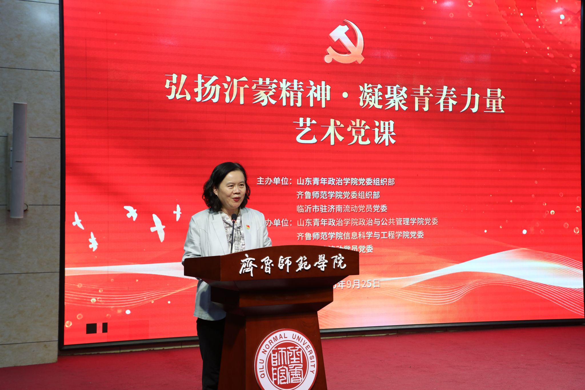 为进一步弘扬沂蒙精神,增强广大师生党员的爱国情怀和时代担当,更好地落实《全国党员教育培训工作规划(2024-2028年)》要求,9月25日下午,由齐鲁师范学院党委组织部联合山东青年政治学院党委组织部、临沂市驻济南流动党员党委共同主办,信息科学与工程学院承办的“弘扬沂蒙精神·赓续红色血脉”艺术党课进校园活动在第一学术报告厅举行。齐鲁师范学院党委副书记赵敏出席活动并致辞,活动由党委组织部副部长李岳飞主持。