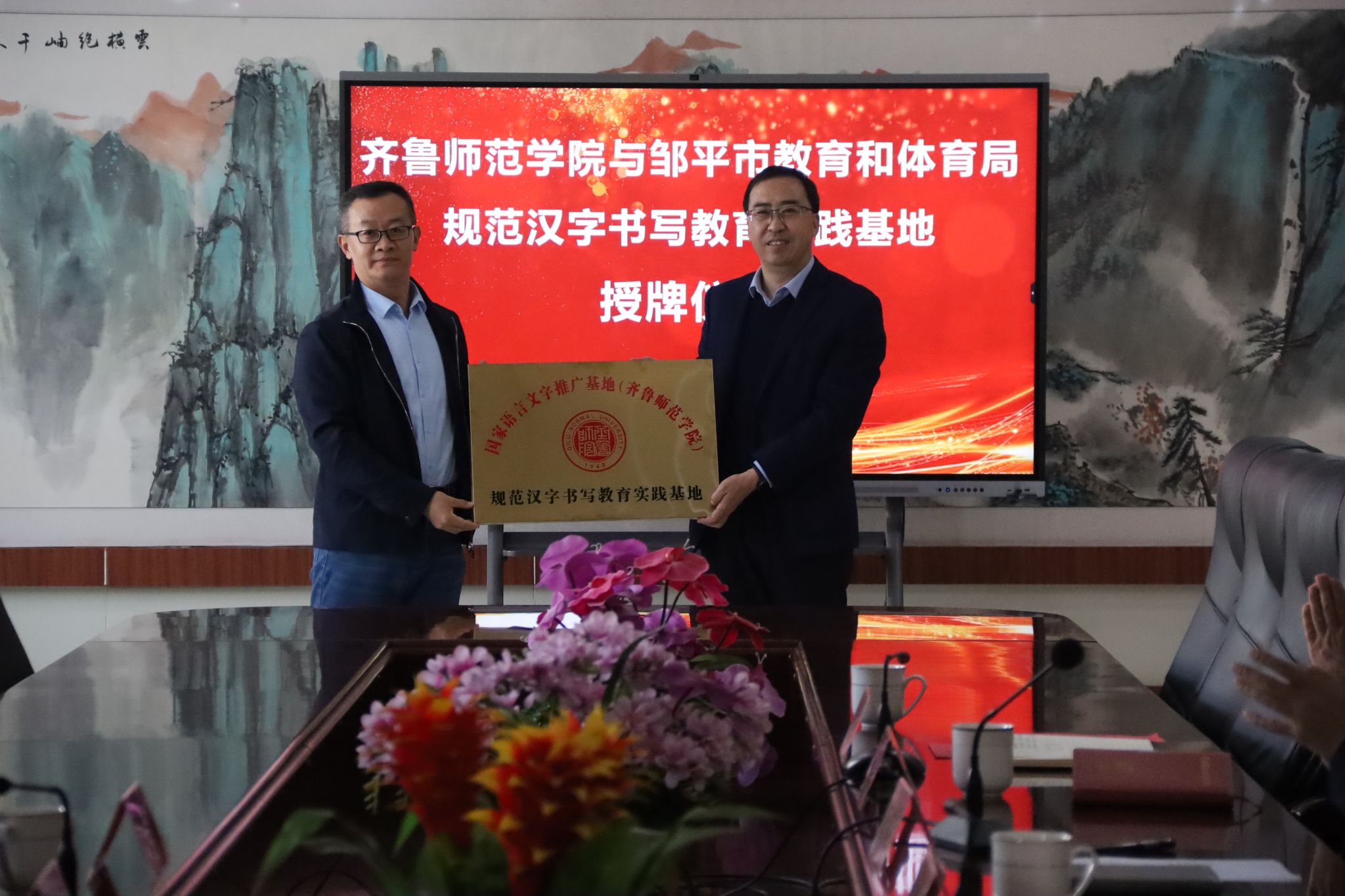 孙洪兆代表齐鲁师范学院向邹平市教育和体育局、黄山实验小学授予“国家语言文字推广基地(齐鲁师范学院)规范汉字书写教育实践基地”牌匾。