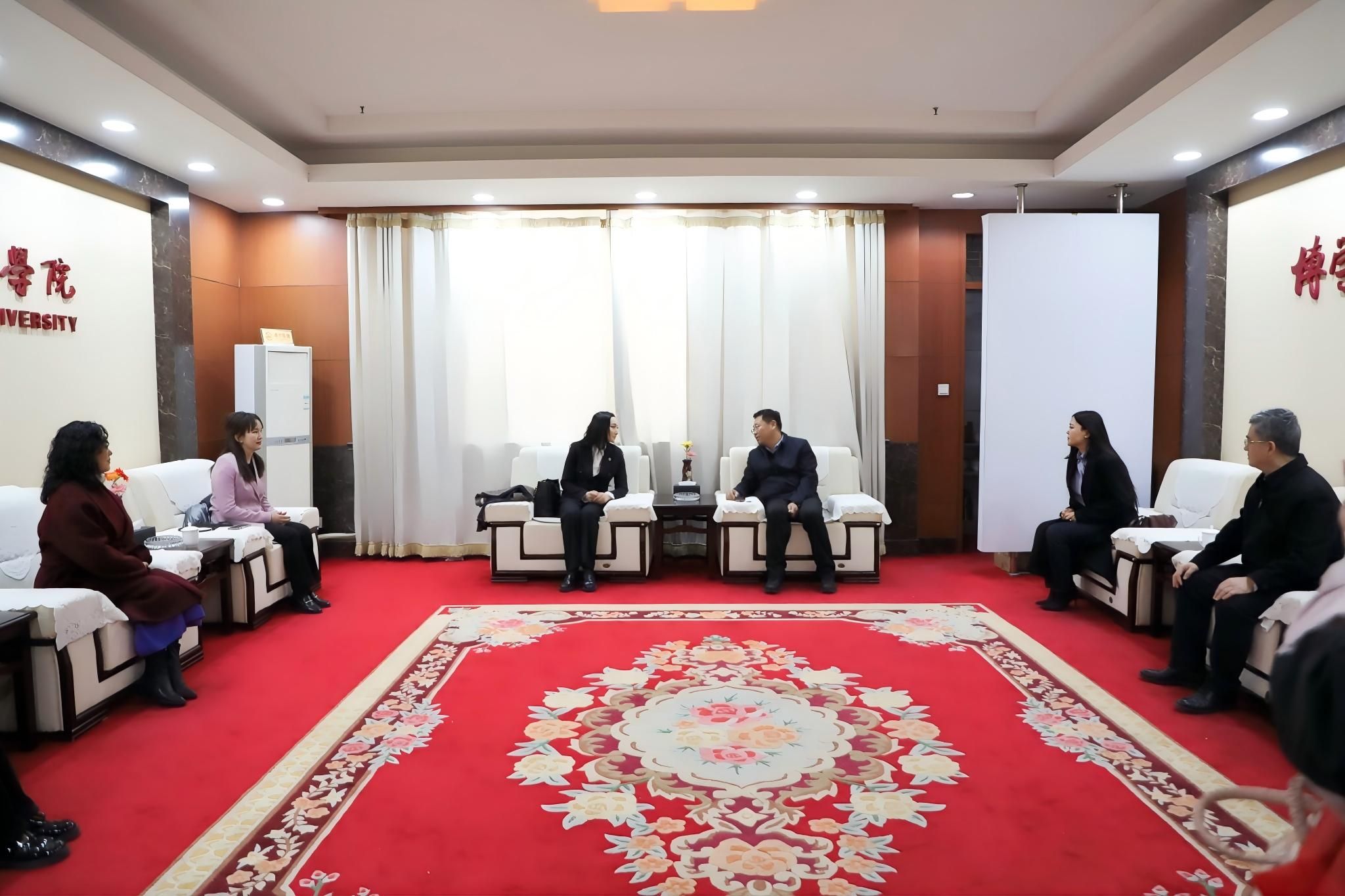 12月18日,蒙古大札撒国际大学师生代表团一行32人来校交流访问。学校党委副书记、校长郑秀文,副校长张兆明亲切接见。双方就研究生联合培养、师生互换交流、学术科研合作、文化体育互动等多个领域进行了交流探讨。见面会后,蒙古师生参观了学校齐鲁文化长廊,近距离感受了中华优秀传统文化的深厚底蕴。