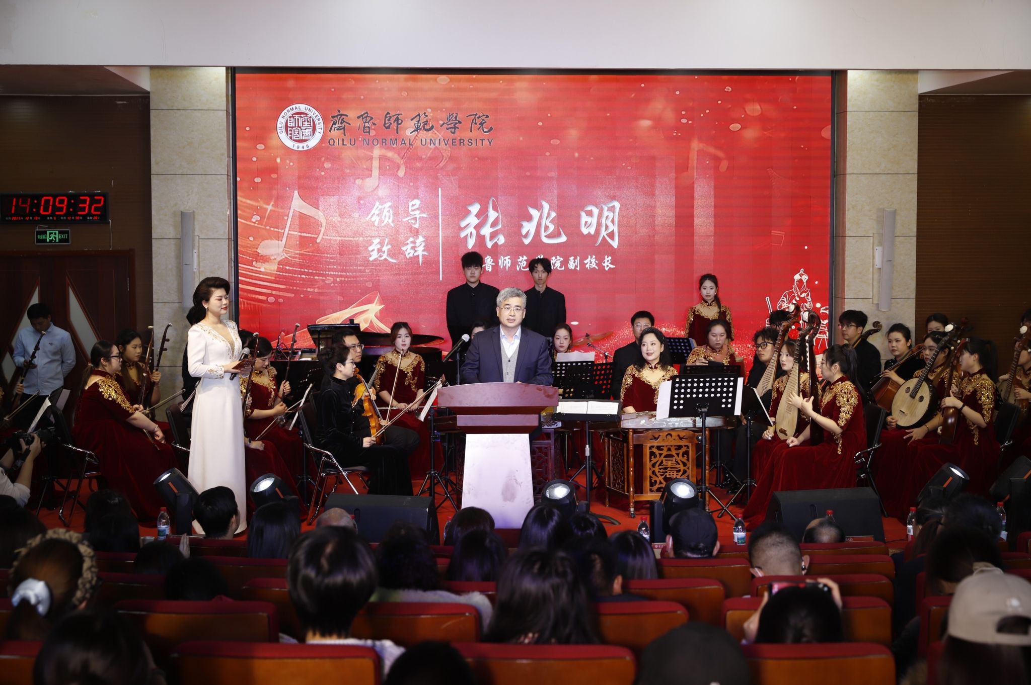 章丘区高教办主任宋万意,原章丘四中副校长、齐鲁师范学院校友吕庆生,章丘区教体局体卫艺科科长孙悦欣以及章丘中小学音乐骨干教师;齐鲁师范学院国际交流与合作处处长何艳、教务处处长张克玉,学生工作部部长李玮、音乐学院领导班子以及师生代表参加活动。