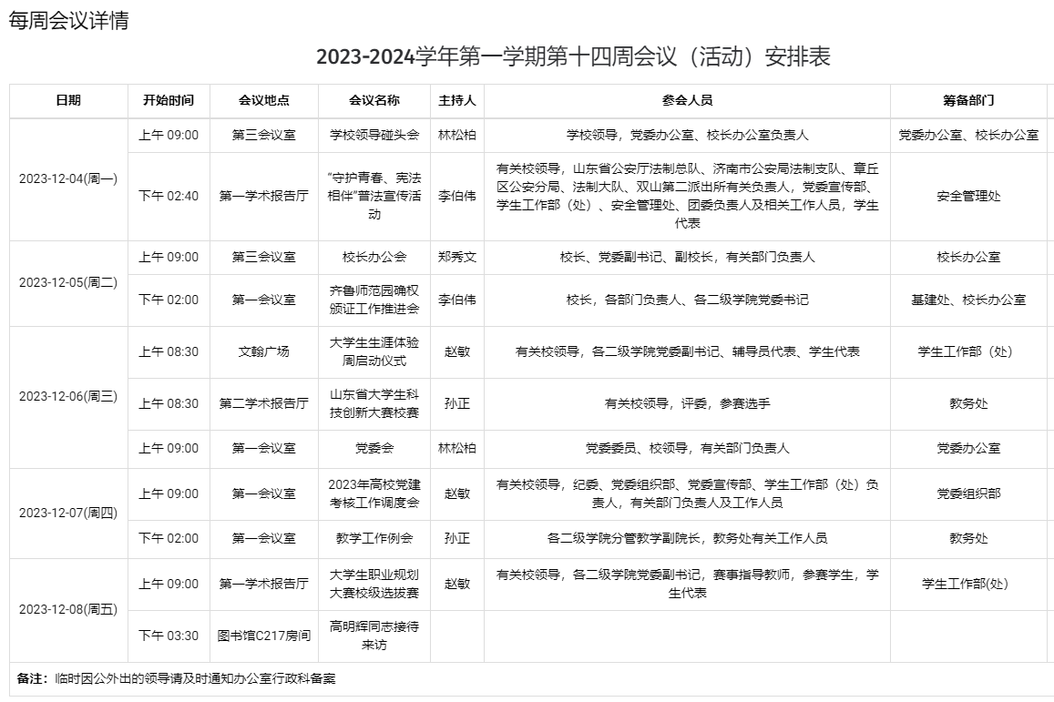 2023-2024学年第一学期第十四周会议(活动)安排表
