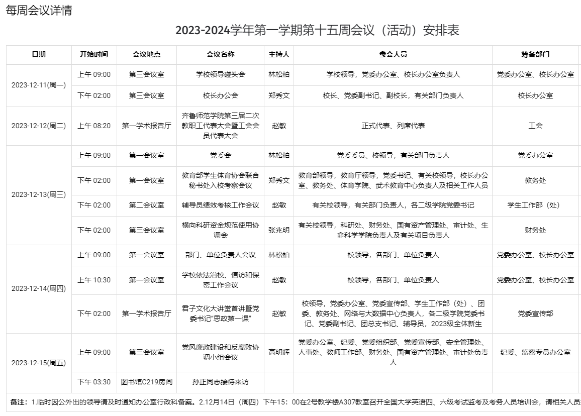 2023-2024学年第一学期第十五周会议(活动)安排表