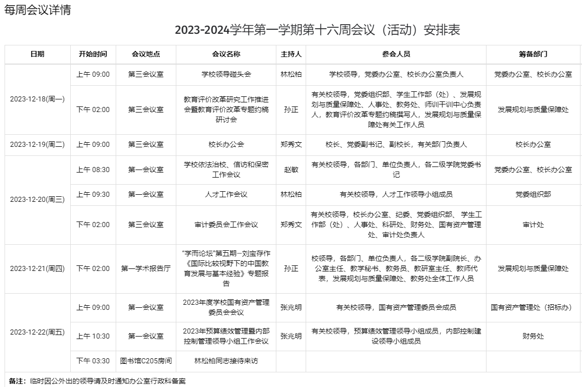 2023-2024学年第一学期第十六周会议(活动)安排表