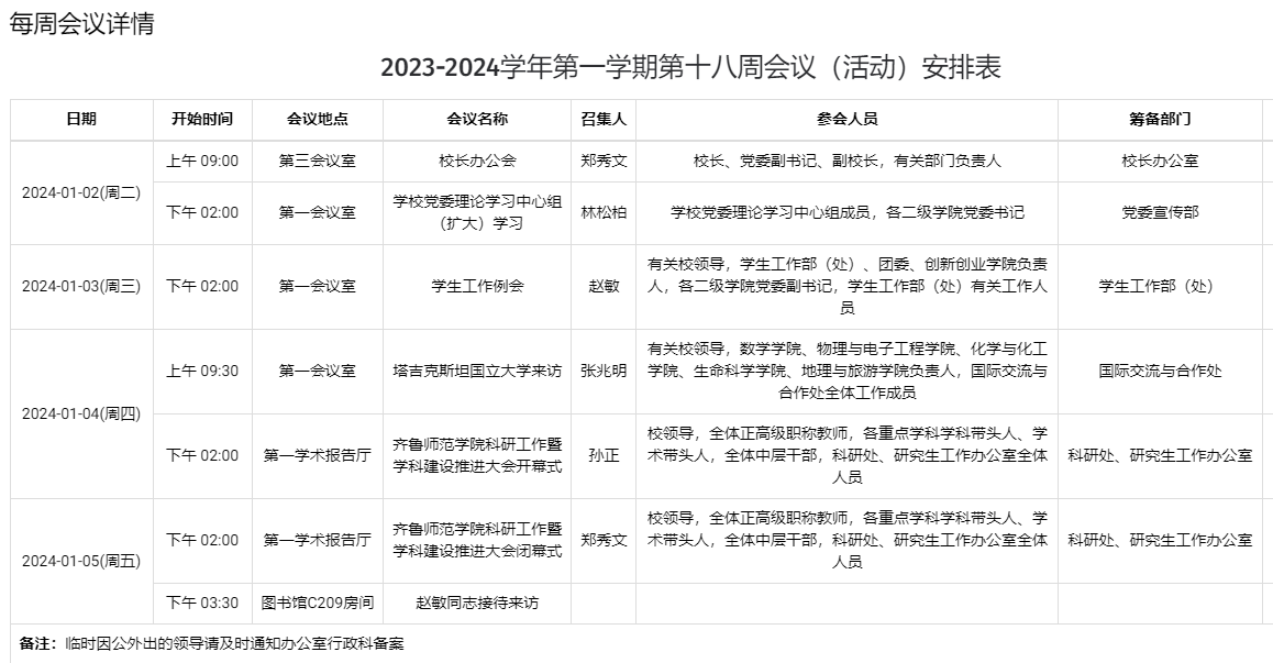 2023-2024学年第一学期第十八周会议(活动)安排表