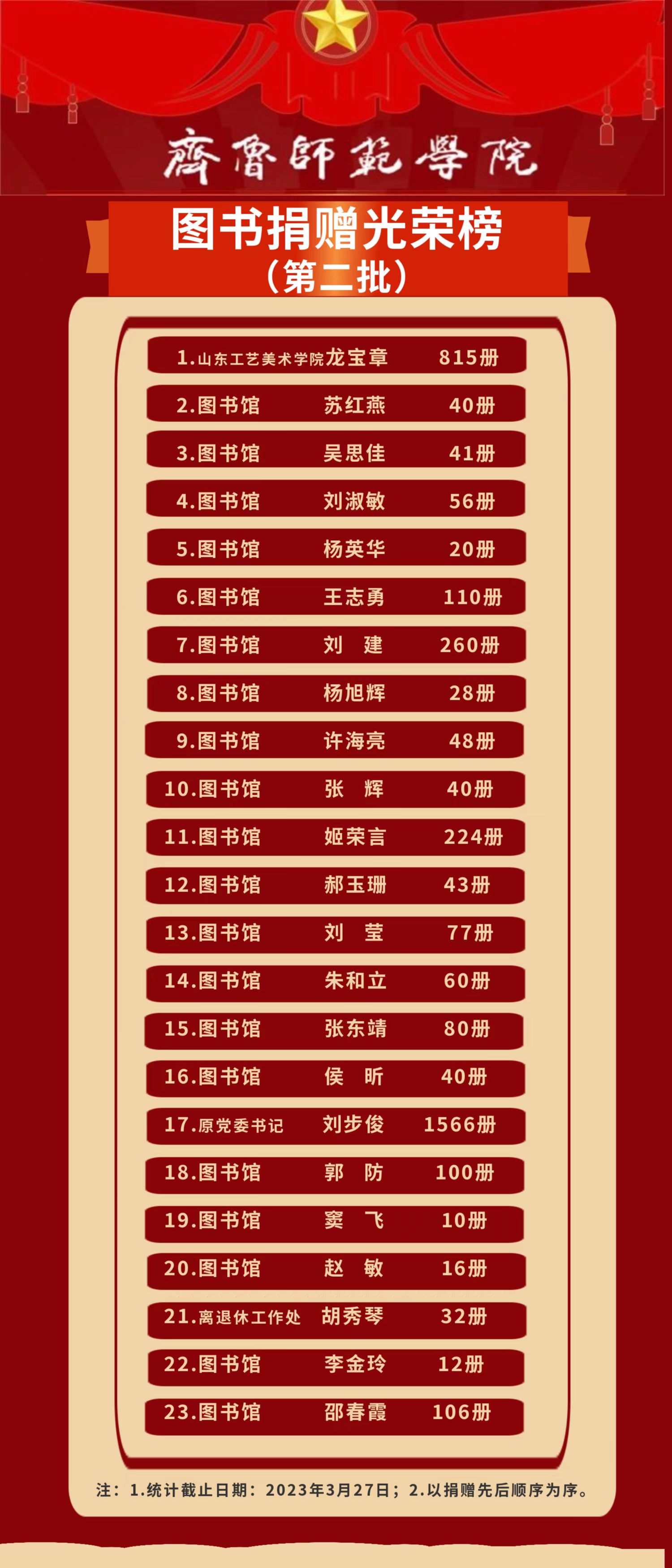 首批“齐鲁师范学院图书捐赠光荣榜”发布后,得到了师生们的积极响应,截至目前学校已收到各类捐赠图书4729册。其中,原党委书记刘步俊同志捐赠图书1566册,山东工艺美术学院龙宝章教授捐赠图书、期刊815册。