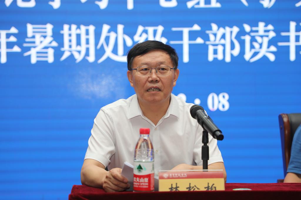 林松柏在主持讲话中高度肯定了此次读书班的成效,并就如何贯彻落实好本次读书班会议精神,以实际行动推动学校事业高质量发展,提出三点要求。一是谋划全局、站位高远,准确把握高质量发展。要立足“两个大局”,心怀“国之大者”,牢记为党育人、为国育才的初心使命,把人才培养作为核心任务,把科学研究作为基础支撑,把社会服务作为重要途径,把文化创新作为自觉行动,精确识变、科学应变、主动求变,以更高站位去审视和思考实现高质量发展的路径。二是狠抓落实、务求实效,强力保障高质量发展。要用党建引领发展目标的决策、引领发展目标的实施、引领发展目标的实现,全力推动学校高质量发展战略目标要求落实落地,一体推进党建与中心工作深度融合,切实以高质量党建引领保障学校高质量发展。三是勇于担当,善于作为,全力推进高质量发展。希望处级干部们把使命放在心上、把责任扛在肩上,做起而行之的行动者、当攻坚克难的奋斗者,在层层历练中积累经验,不断开创工作新局面,使个人更好适应学校事业发展需要,跟得上学校事业发展步伐。