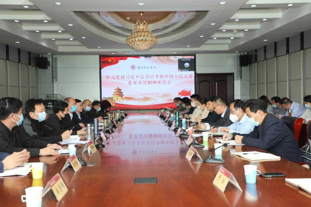 王玉华在讲话中传达了5月12日省教育厅、省委教育工委召开的学习贯彻习近平总书记考察中国人民大学时重要讲话精神座谈会有关会议精神,对近期学校学习宣传情况给予肯定。他指出,学校通过第一时间部署、第一议题传达、第一标准推动,利用线上线下一体学,形成党委引领学、党员干部带头学、全体师生踊跃学的浓厚氛围,迅速掀起了学习热潮。召开座谈会旨在进一步深化认识、统一思想、凝聚共识,结合实际抓好贯彻落实。学校要聚焦“为谁培养人、培养什么人、怎样培养人”这一教育的根本问题,坚持把立德树人作为根本任务,深入学习贯彻习近平总书记对高校师生一系列重要讲话精神,积极推动学校在新时代新阶段高质量发展。