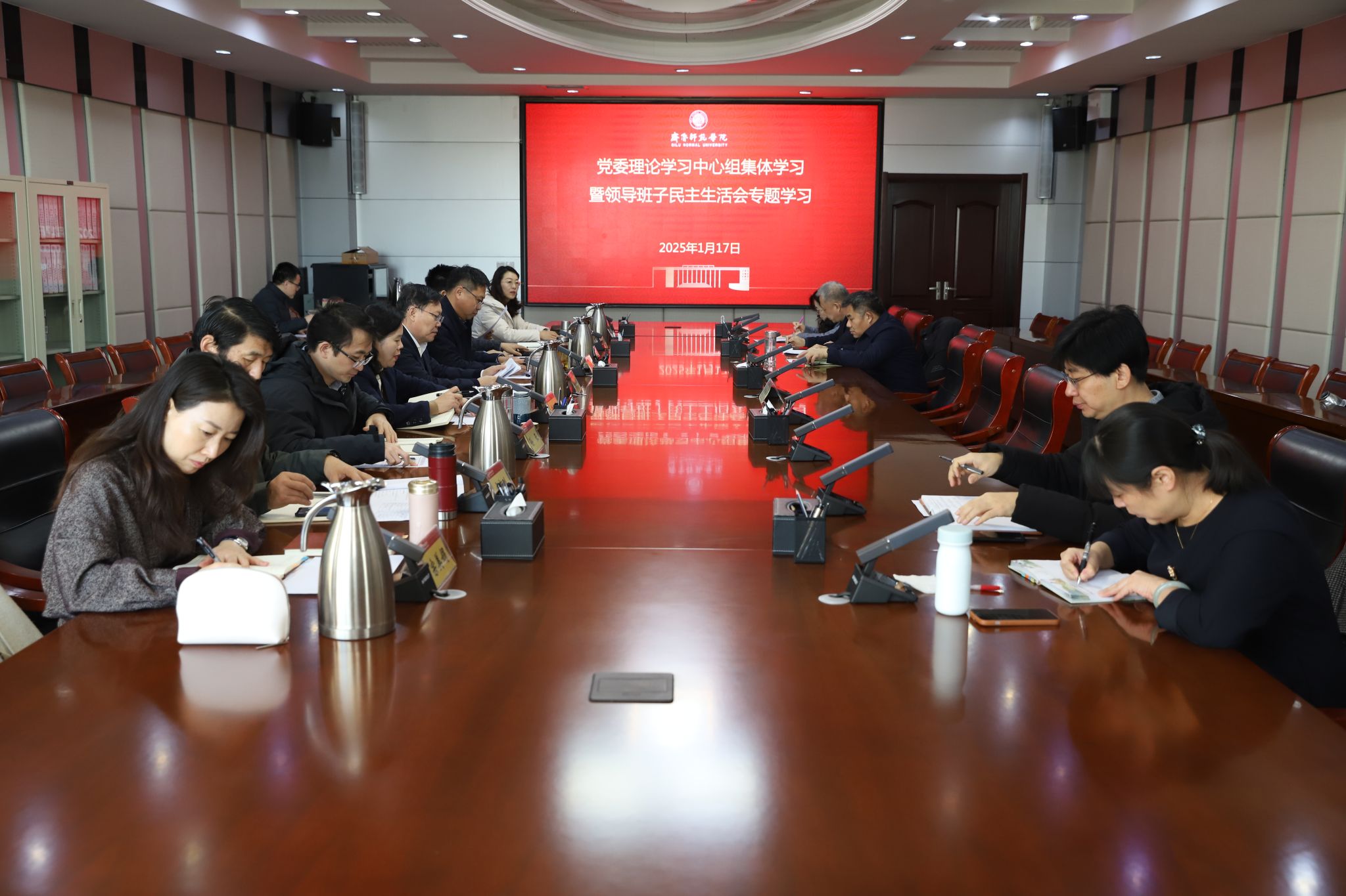 1月17日上午,学校召开党委理论学习中心组学习会,围绕《论党的自我革命》《习近平著作选读》等重点篇目,深入领会习近平总书记关于党的建设的重要思想、关于党的自我革命的重要思想,学习贯彻习近平总书记视察山东重要讲话和重要指示批示精神以及全国教育大会精神,为高质量开好领导班子民主生活会开展会前专题学习。学习会由党委书记林松柏主持。