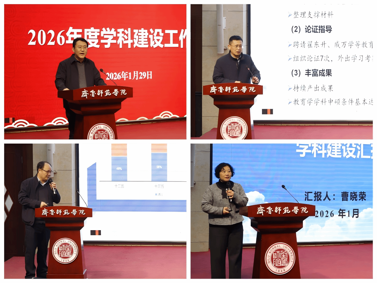 会上,科研处(学科建设办公室)处长于家杰宣读了2026年各二级学院、科研机构科研目标任务及重点工作安排;教师教育学院院长刘丙利、生命科学学院院长崔大勇、化学与化工学院院长曹晓荣、物理与电子工程学院副院长刘萌、经济与管理学院院长周健、地理与旅游学院院长王敏、信息科学与工程学院院长杜建彬分别代表教育、生物与医药、材料与化工、电子信息、应用经济学、地理学、人工智能等重点学科汇报了重点学科建设情况及2026年学科建设工作计划。