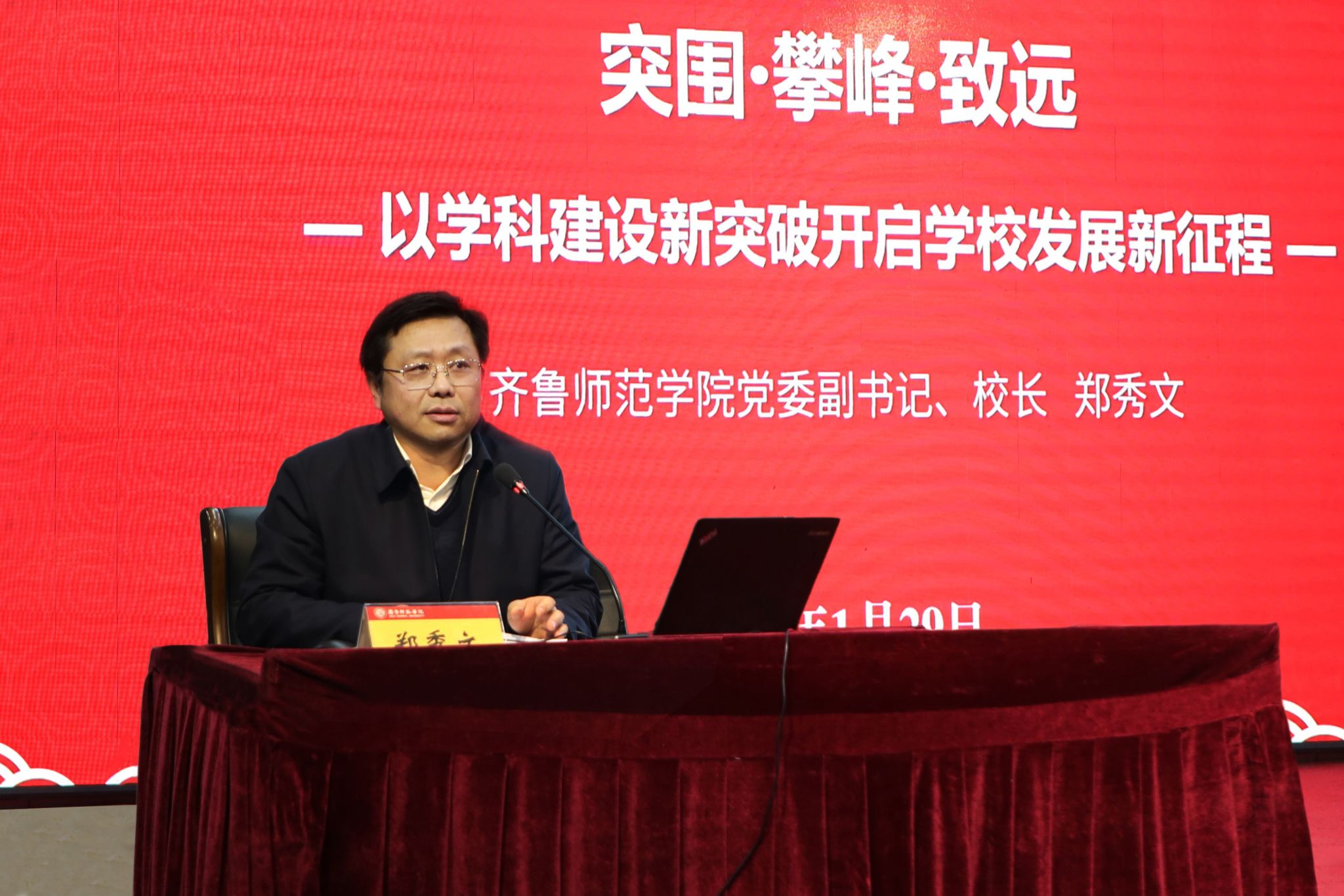 1月29日,学校在章丘校区第一学术报告厅召开2026年度学科建设工作会议。会议立足“十五五”开局关键节点,全面总结学科建设成效,深入分析当前形势与挑战,明确学科建设重点任务,为推动学科建设迈上新台阶、实现学校事业高质量跨越式发展统一思想、凝聚共识。学校党委副书记、校长郑秀文出席会议并作题为《突围·攀峰·致远——以学科建设新突破开启学校发展新征程》的主题报告。学校党委副书记赵敏主持会议,党委委员、纪委书记、监察专员高明辉,党委委员、副校长孙洪兆,党委委员、宣传部部长孙磊,党委委员、组织部部长宗美娟出席会议。
