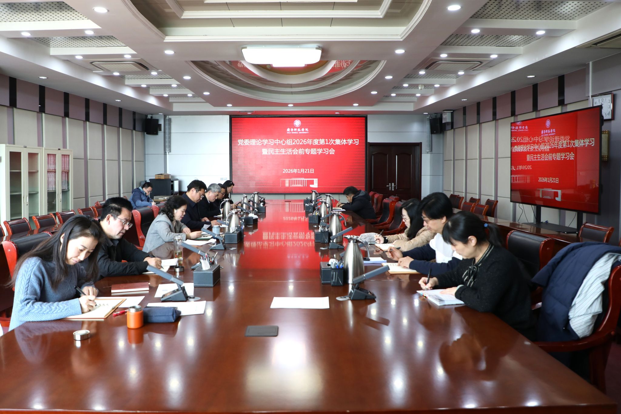 1月21日,学校党委理论学习中心组进行集体学习,学习贯彻党的二十届四中全会精神,深入学习领会习近平总书记关于党的建设的重要思想、关于党的自我革命的重要思想以及关于加强党的纪律建设、作风建设的重要论述,学习党章和《中国共产党纪律处分条例》等党内法规,为高质量开好民主生活会打牢思想基础。学习会由学校党委副书记、校长郑秀文主持。