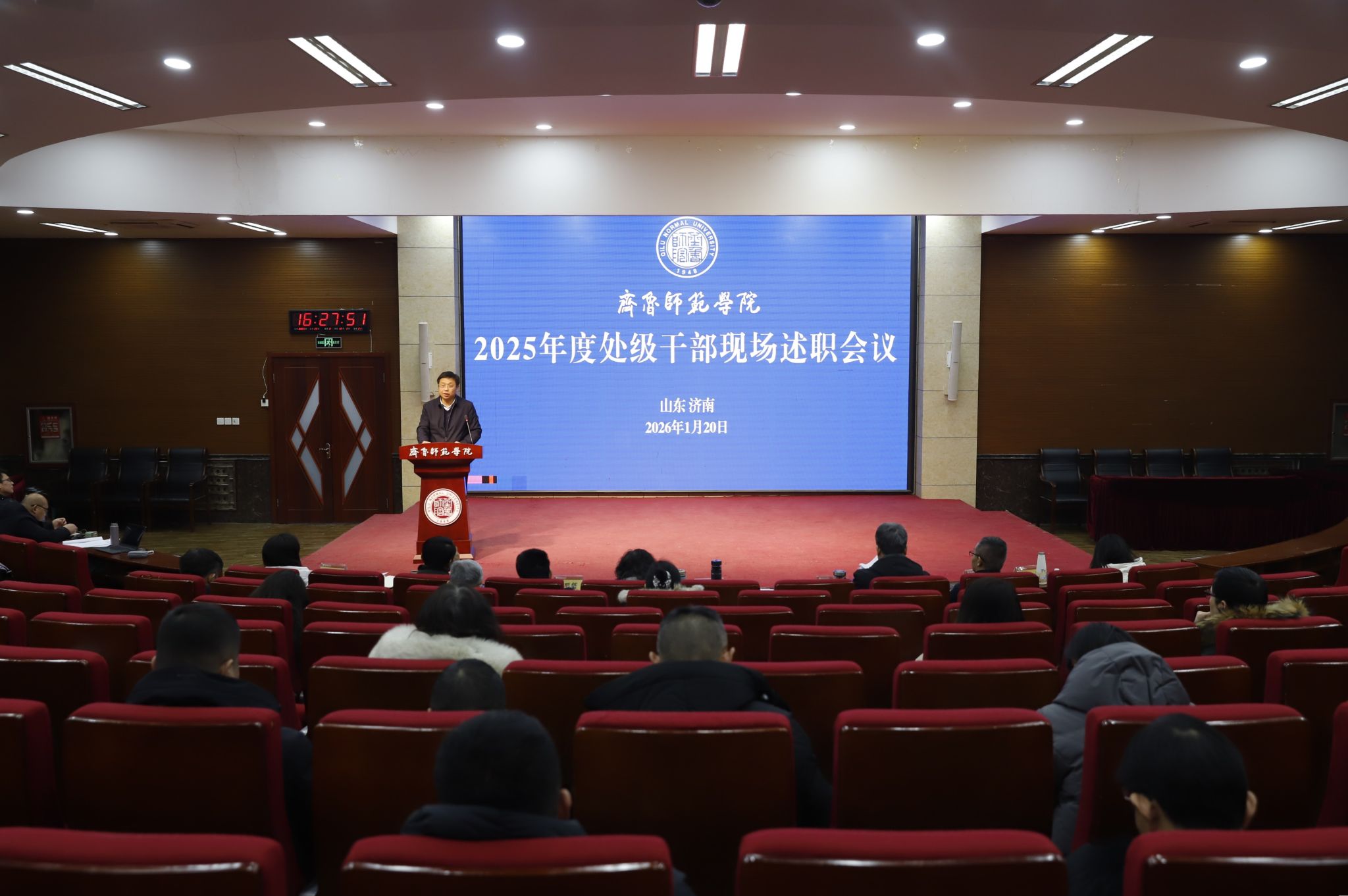 1月20日,学校在章丘校区第一学术报告厅召开2025年度处级干部现场述职会议。党委副书记、校长郑秀文主持会议并讲话。全体校领导出席会议。