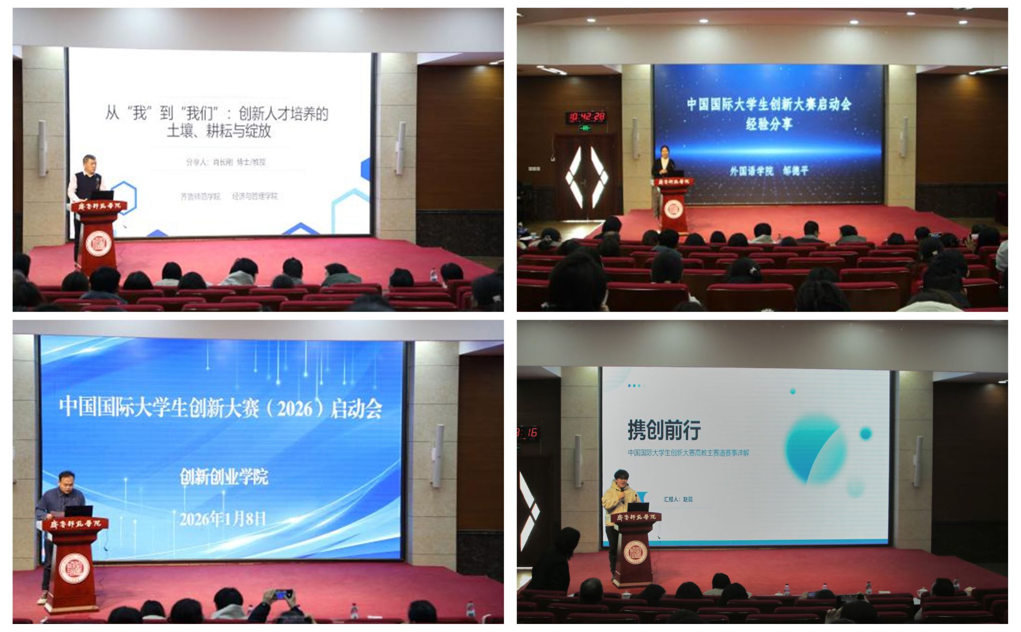 会上竞赛指导教师和学生代表分享参赛经验。中国国际大学生创新大赛国赛铜奖指导教师肖长刚以《从“我”到“我们”:创新人才培养的土壤、耕耘与绽放》为题,围绕“创新教育三部曲”,讲述备赛历程和团队成长;“挑战杯”山东省课外学术科技作品竞赛特等奖指导教师邹德平结合实战经验,为未来参赛师生提出四点具体建议;中国国际大学生创新大赛国赛铜奖负责人杨津宁分享了参与《菜富通》项目的感悟;山东大学赵晨从大赛意义、赛道逻辑与备赛策略等角度进行大赛进行全面剖析,鼓励同学们勇于突破自我,在创新实践中收获成长。